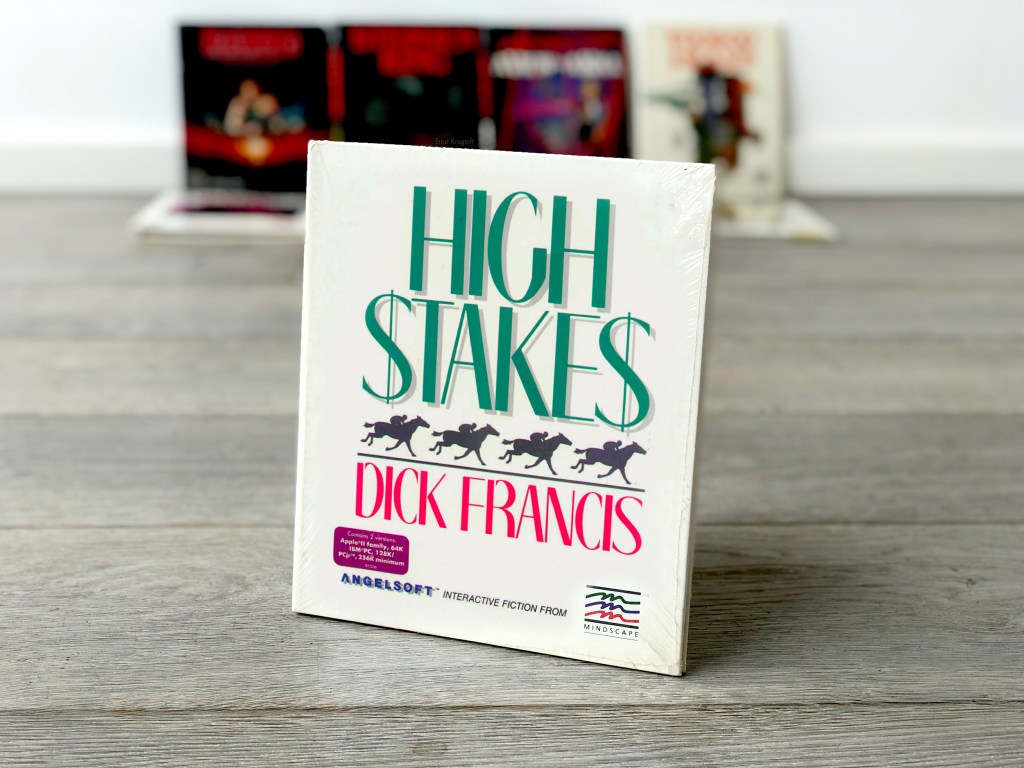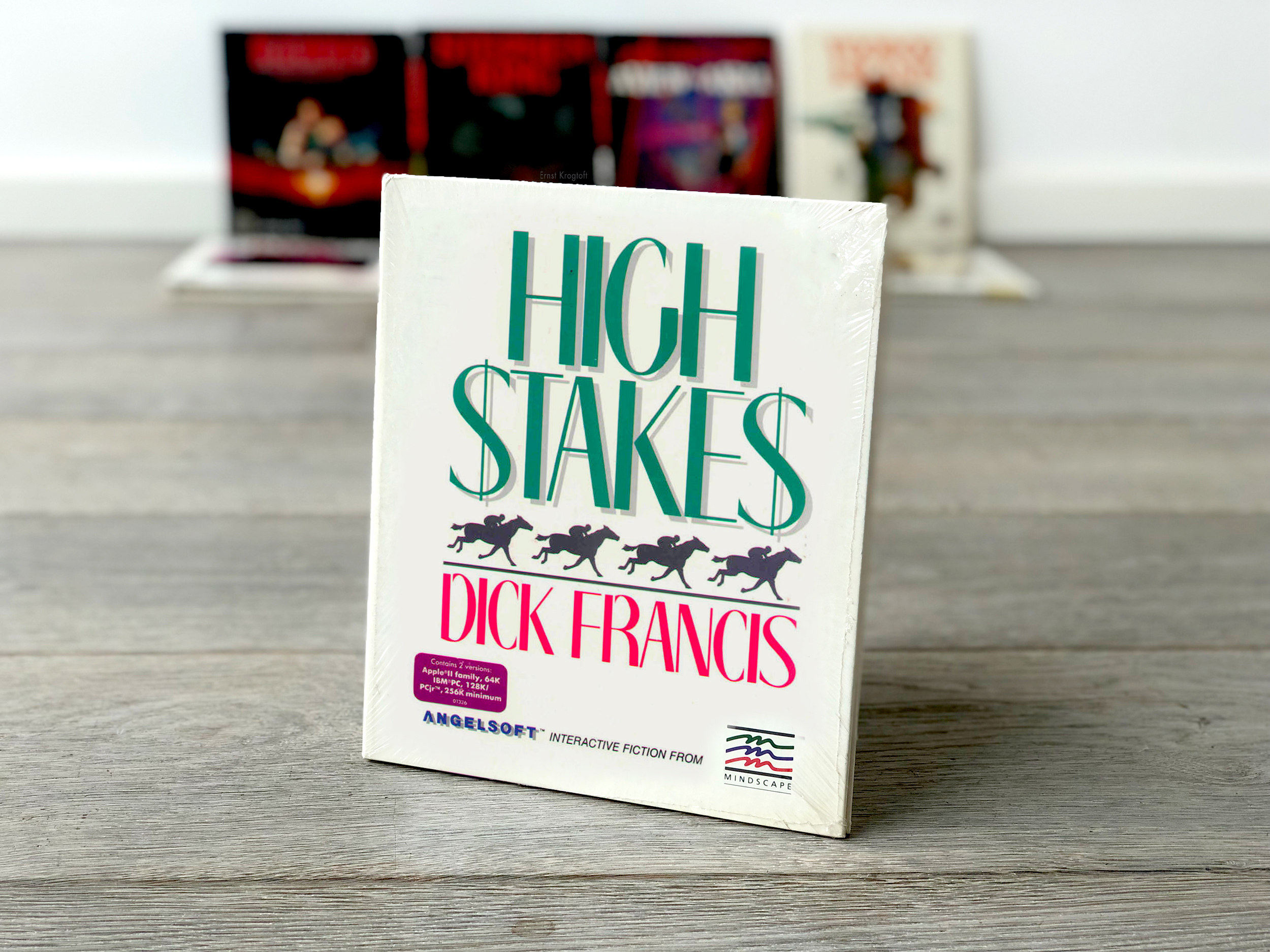 High $take$ from 1986, was the computer game adaption of Dick Francis’ High Stakes. The story centers around horse racing, a common theme through Francis’ books, and is chock-full of mystery and suspense.