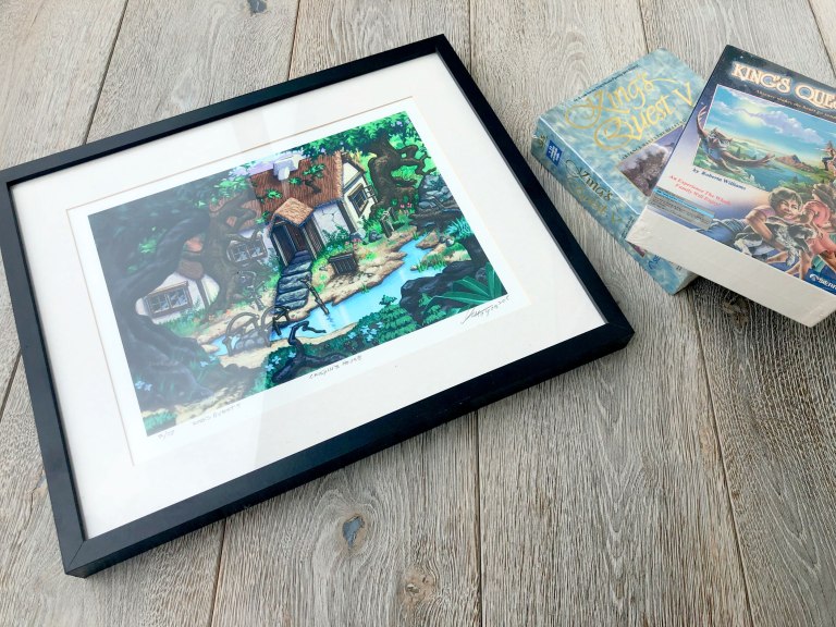 It depicts the sleepy Serenia home of the wizard Crispin, owner of King Graham’s traveling companion Cedric the owl. The cottage is overgrown but tranquil and the surrounding vegetation hints at the beauty, danger, and glory that lies in wait for the gamer with its expressive trees, and glimpse of white-capped mountains and diverse flora.