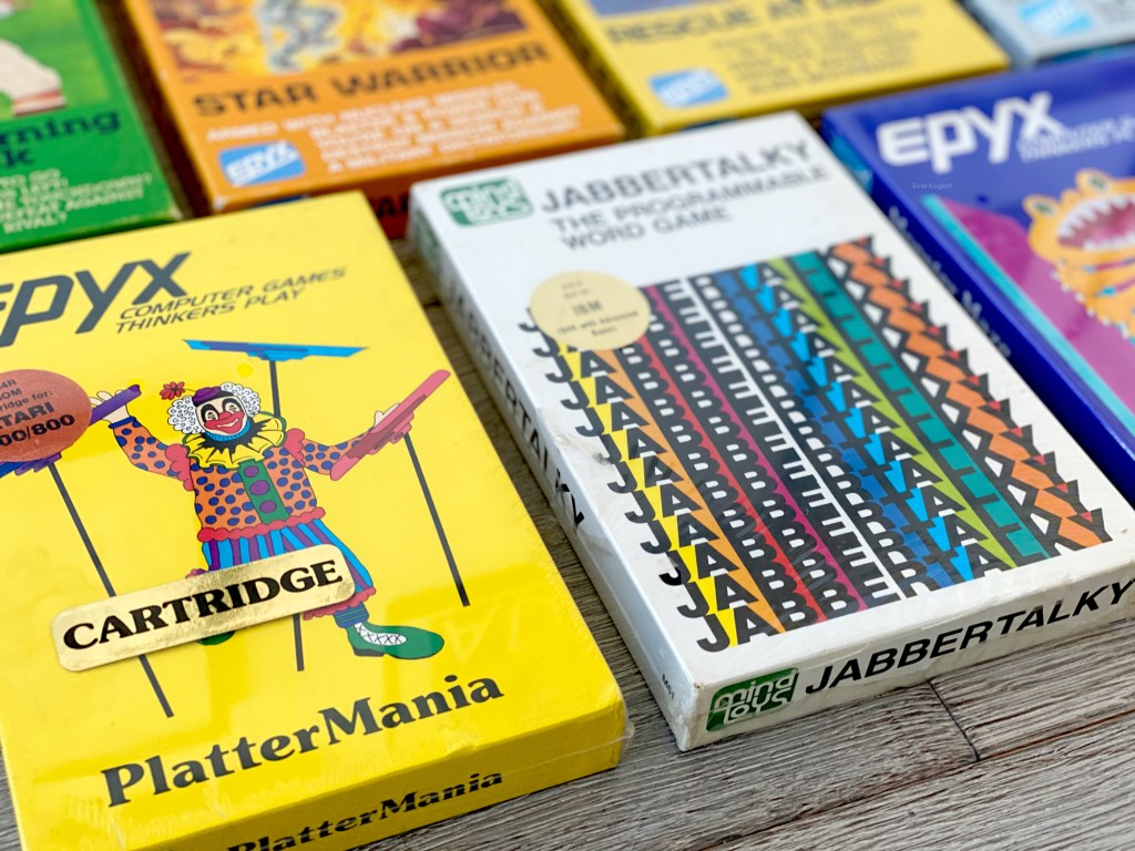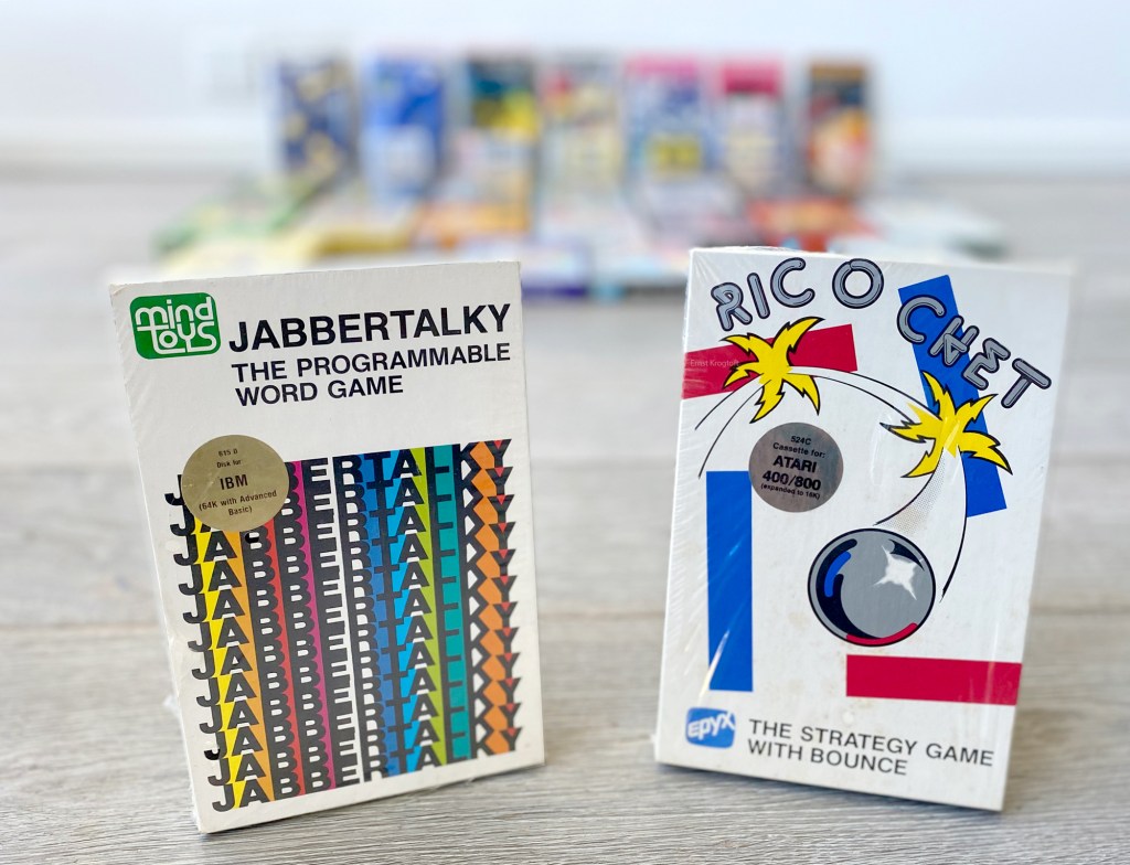The two titles released in the Mind Toys series. Jabbertalky, here the IBM version from either late 1983 or early 1984 and Ricochet for Atari 8-bit released in 1981
