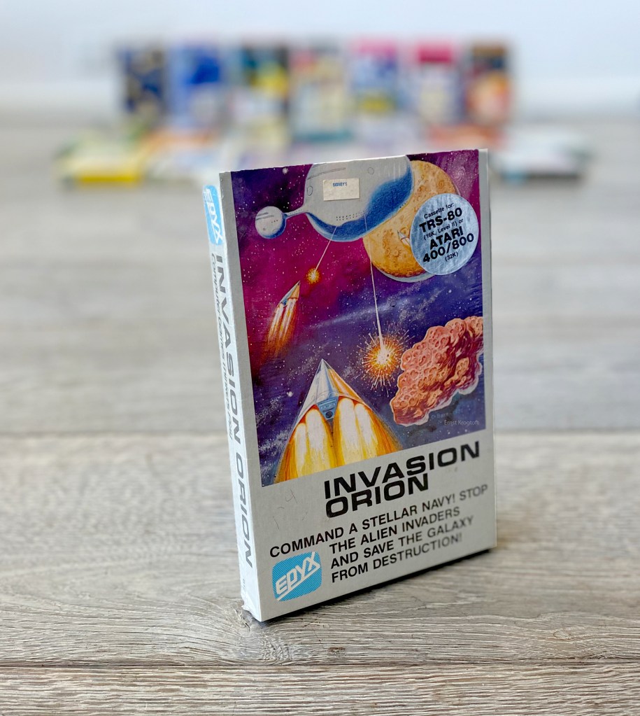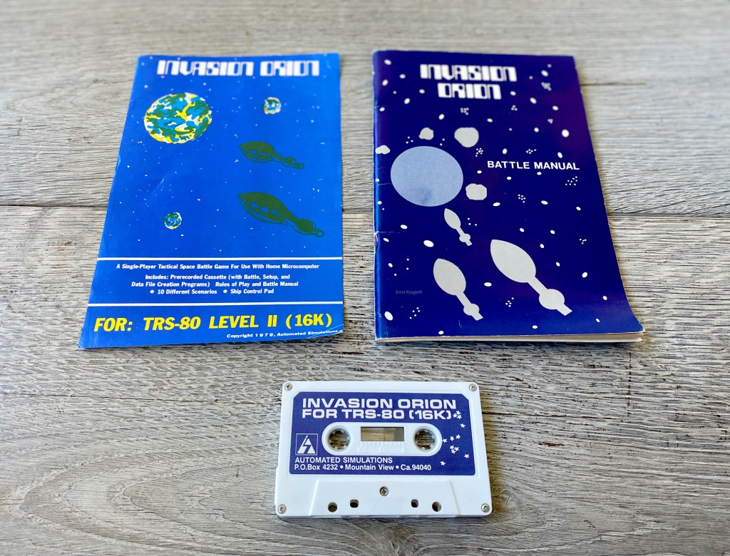 On the left the original TRS-80 version of Invasion Orion from 1979. The TRS-80 version was developed and published at the same time as the Commodore PET version. Apple II users could get their hands on their version a bit later in 1979.