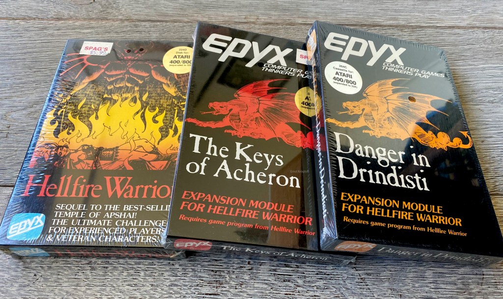 Hellfire Warrior, the only direct sequel to Temple of Apshai, released for the Atari 8-bit in 1980. Here depicted with its two expansion pack, The Keys of Acheron from 1981 and Danger in Drinsti from 1982