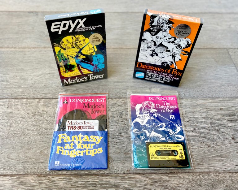 On the left, the 1979 zip-lock release of Morloc’s Tower for the TRS-80 and the rerelease for the Atari 8-bit from 1981