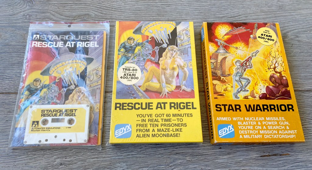 On the left the original baggie version of Rescue at Rigel from 1980, in the center the rerelease for the TRS-80/Atari 8-bit from 1980, on the right Starwarrior for Atari 8-bit from 1981 which only was released in a box