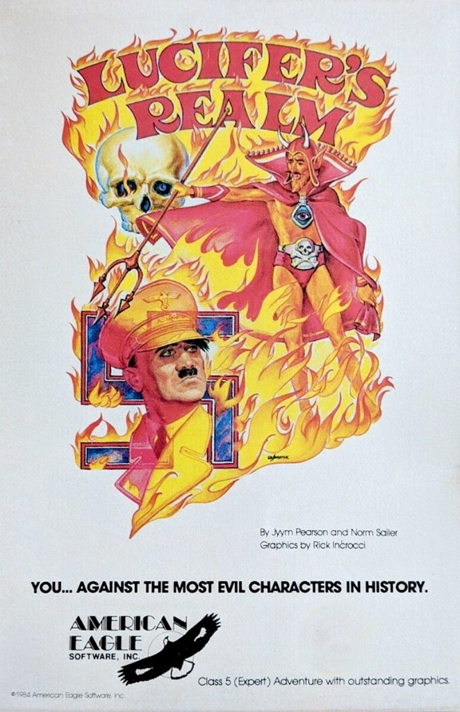 While I haven’t found any evidence indicating it to be true, rumors have it that the American Eagle version of Lucifer’s Realm supposedly was the first computer game to be banned in the U.S., because of its controversial cover art.