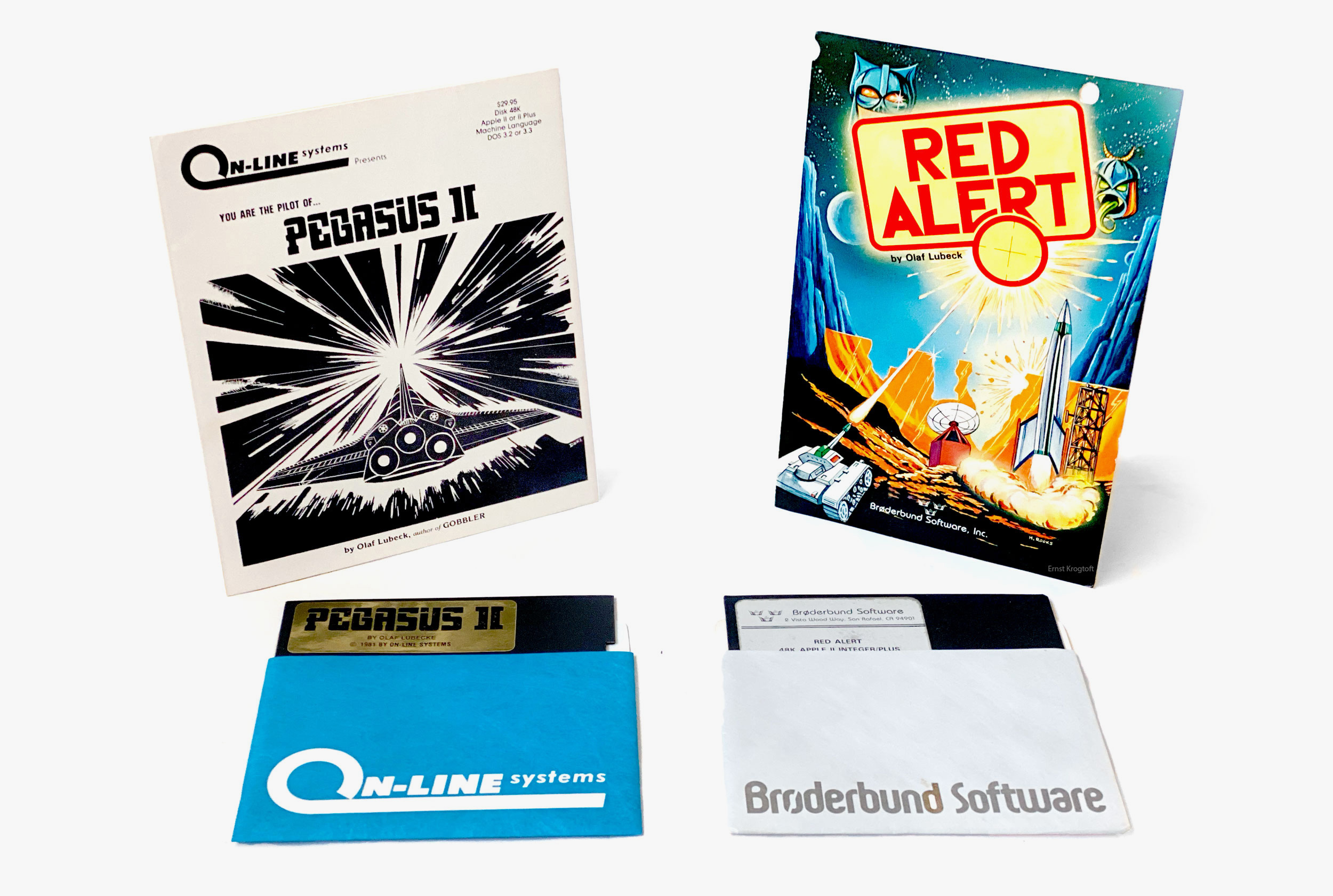 After the release of Gobbler, Lubeck created the two action titles Red Alert and Pegasus II, both for the Apple II and released in 1981. Pegasus was picked up by On-Line Systems and Red Alert by Brøderbund