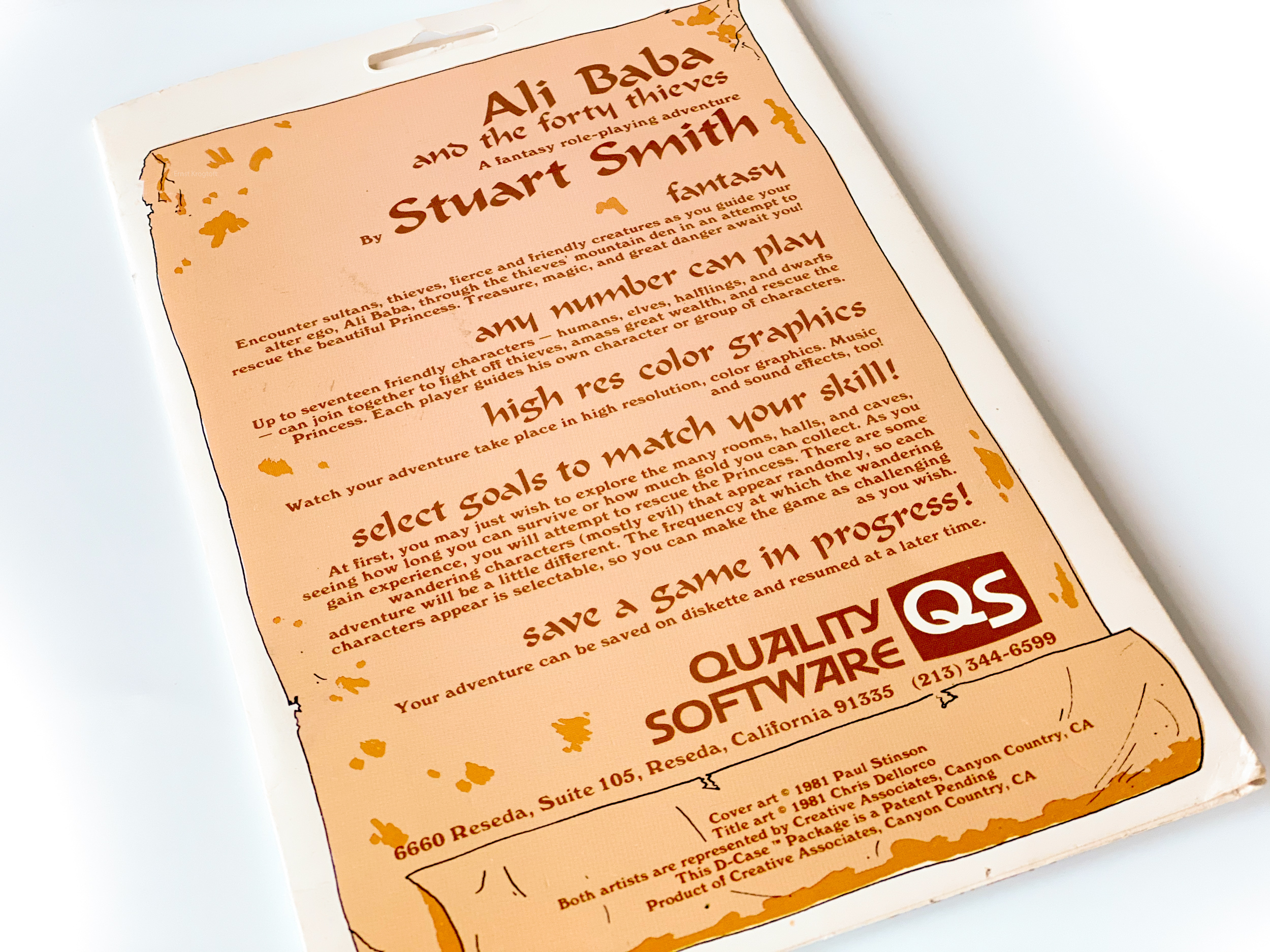 In 1981, Quality Software published Smith’s second title, Ali Baba and the Forty Thieves. Built upon the same underlying engine as Fracas, it was a notable step forward in both design and ambition. The Arabian Nights theme came at the suggestion of Smith’s wife, though in practice, the game’s setting was a playful pastiche, blending characters from the classic One Thousand and One Nights tales with figures from Greek and Roman mythology and even elements borrowed from Tolkien’s Lord of the Rings.