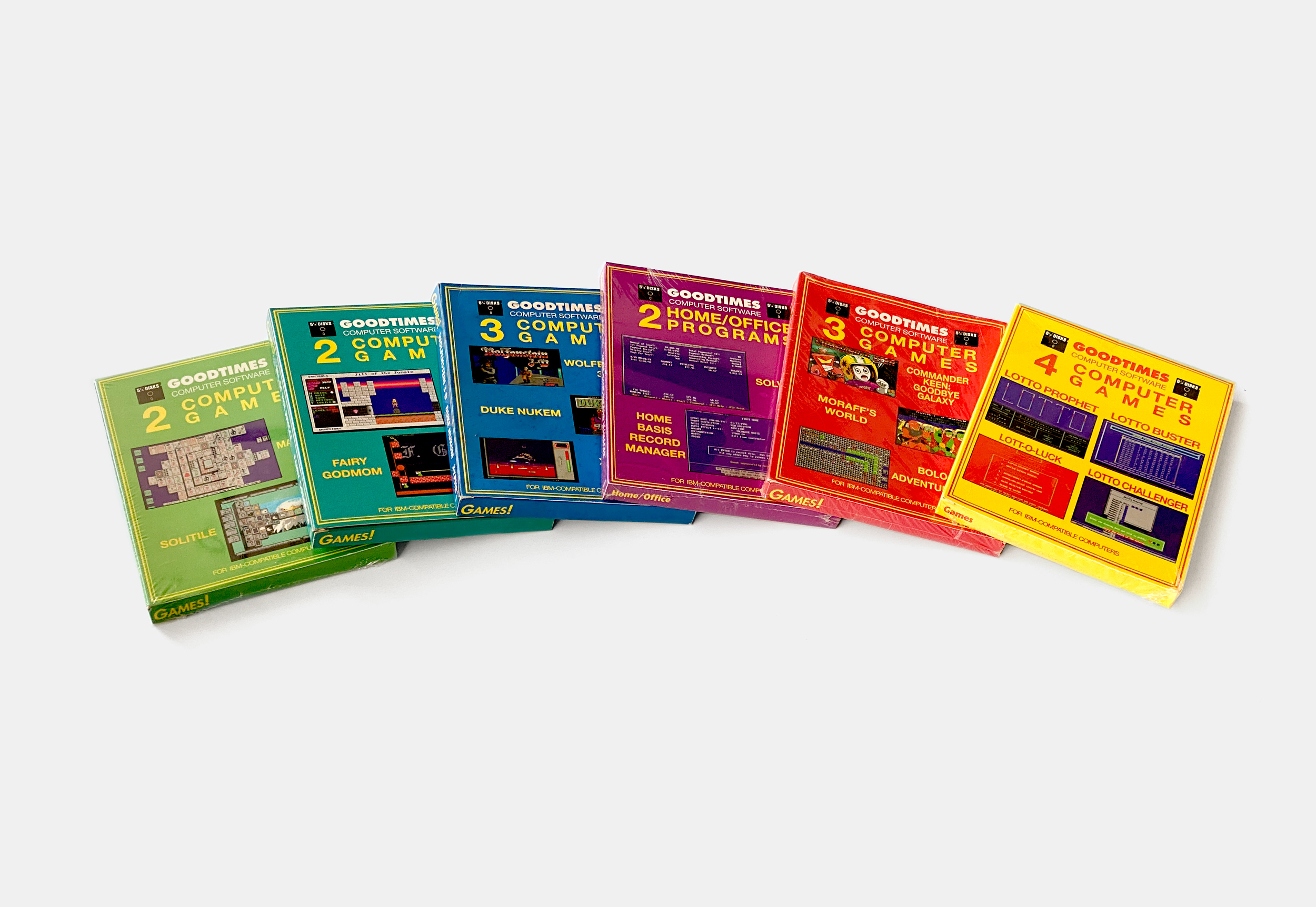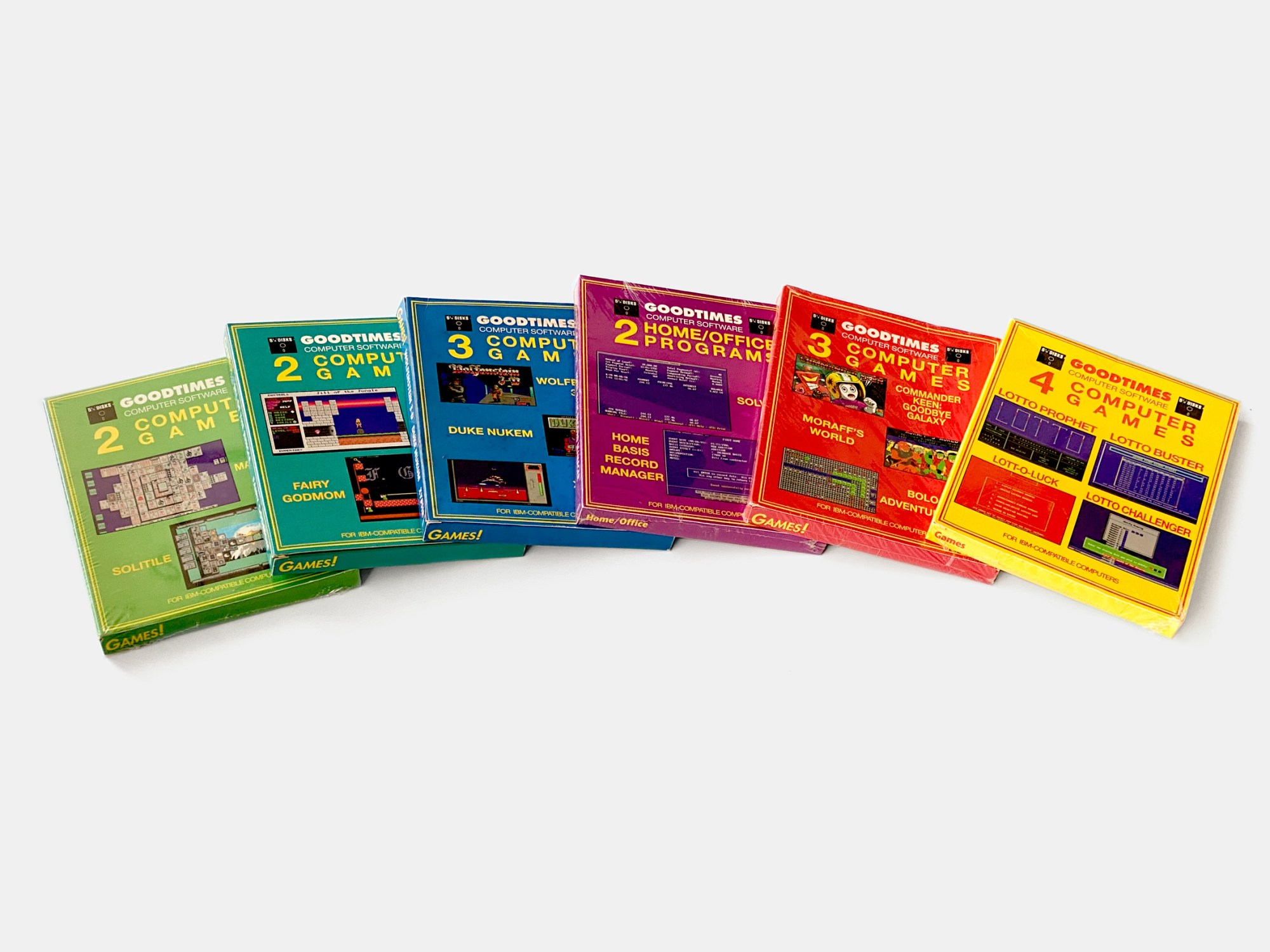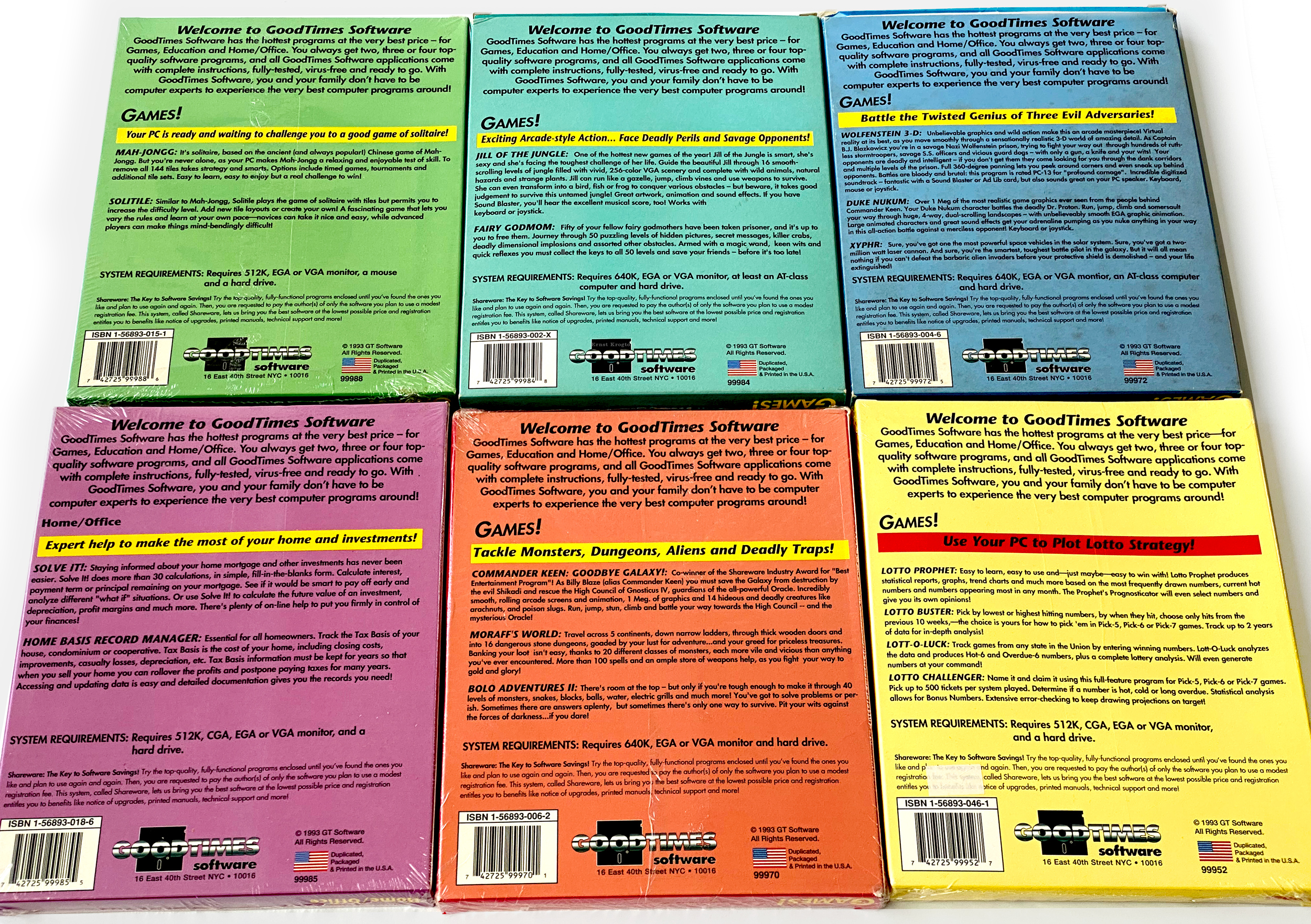 A lineup of GoodTimes Software’s 1993 shareware products, each product including 2 or more shareware titles. These could be purchased for a small price and gave customers an opportunity to try a wide variety of different games and software before paying for a full product
