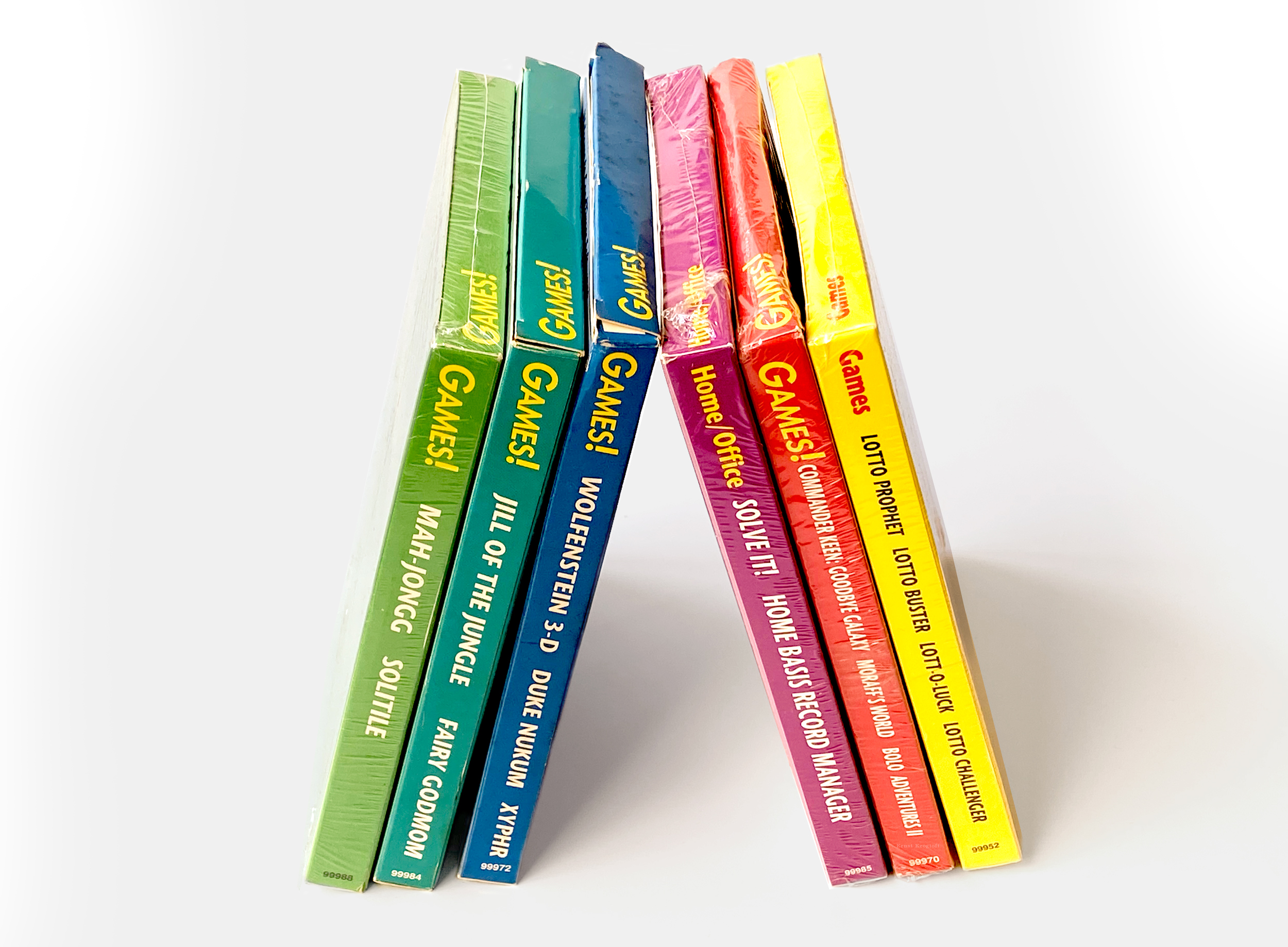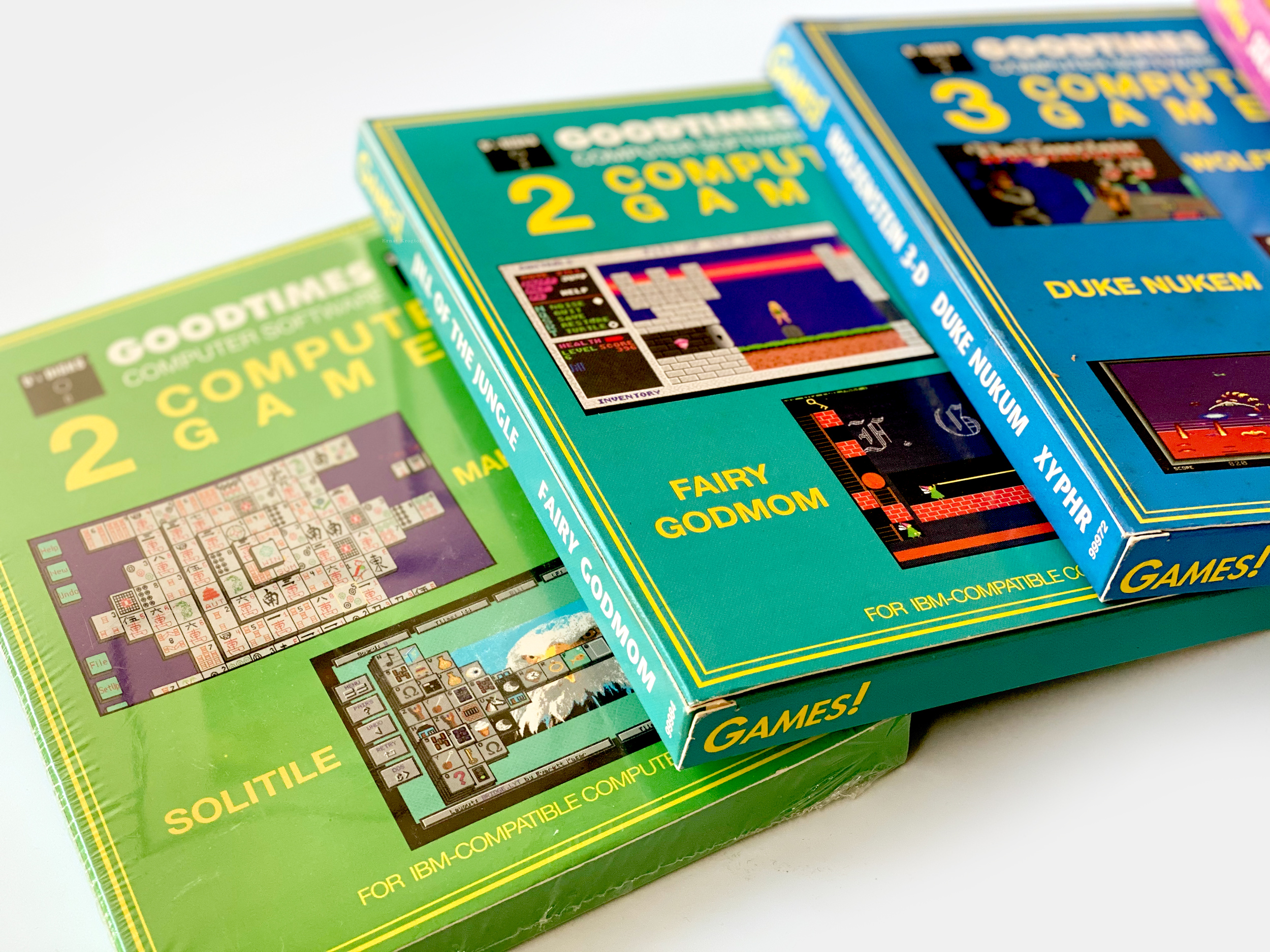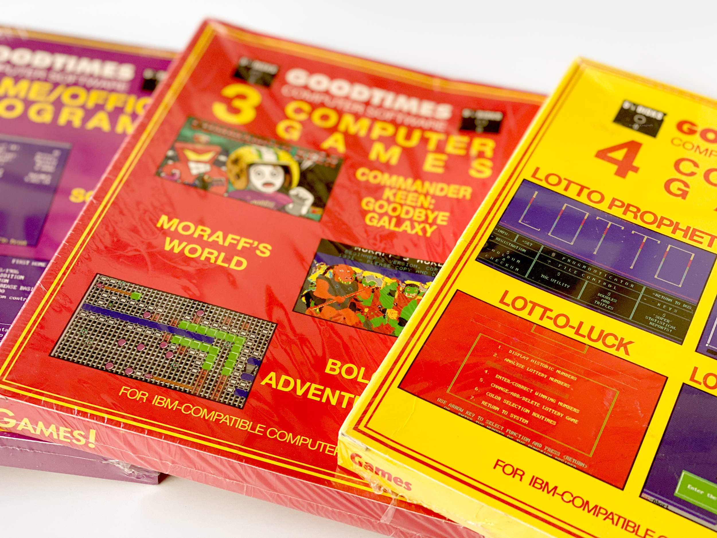 A lineup of GoodTimes Software’s 1993 shareware products, each product including 2 or more shareware titles. These could be purchased for a small price and gave customers an opportunity to try a wide variety of different games and software before paying for a full product