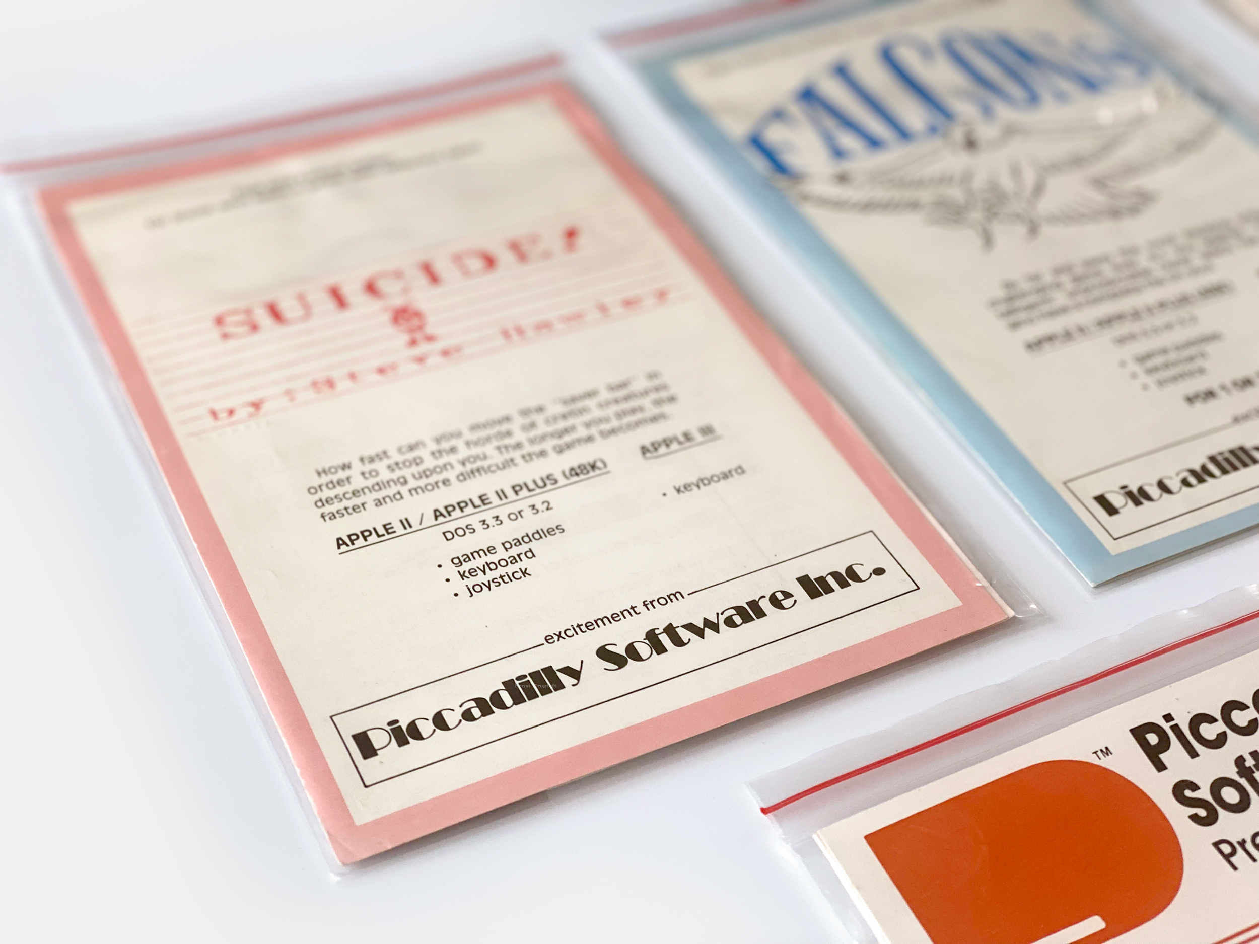 Piccadilly Software’s first published title, Falcons, released for the Apple II in mid-1981. Initially, Falcons was released in the simple blue folder (on the left) but was rereleased later on when the company, in 1982, had developed a final and cohesive design for its packaging.