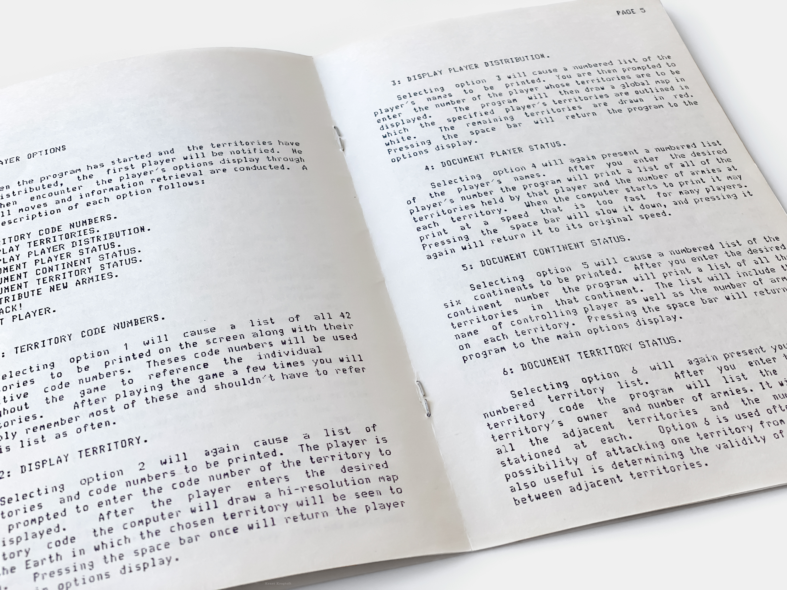 Boyd’s own creative impulses also found expression on the road. Touring between concerts, he carried his Apple II and, on the back of the tour bus, wrote his first and only published game, Global War. A multiplayer clone of the board game Risk, it was coded in Applesoft BASIC. While it offered no single-player mode, it allowed two to nine human players to compete for the 42 territories of the world. Reinforcements were awarded based on the number of territories and continents controlled, and battles were resolved with simulated dice rolls. Each turn concluded with a movement phase, letting players redistribute their armies across conquered lands. Released on cassette for the Apple II in 1979, Global War is now remembered as one of the earliest computerized adaptations of the beloved strategy board game.