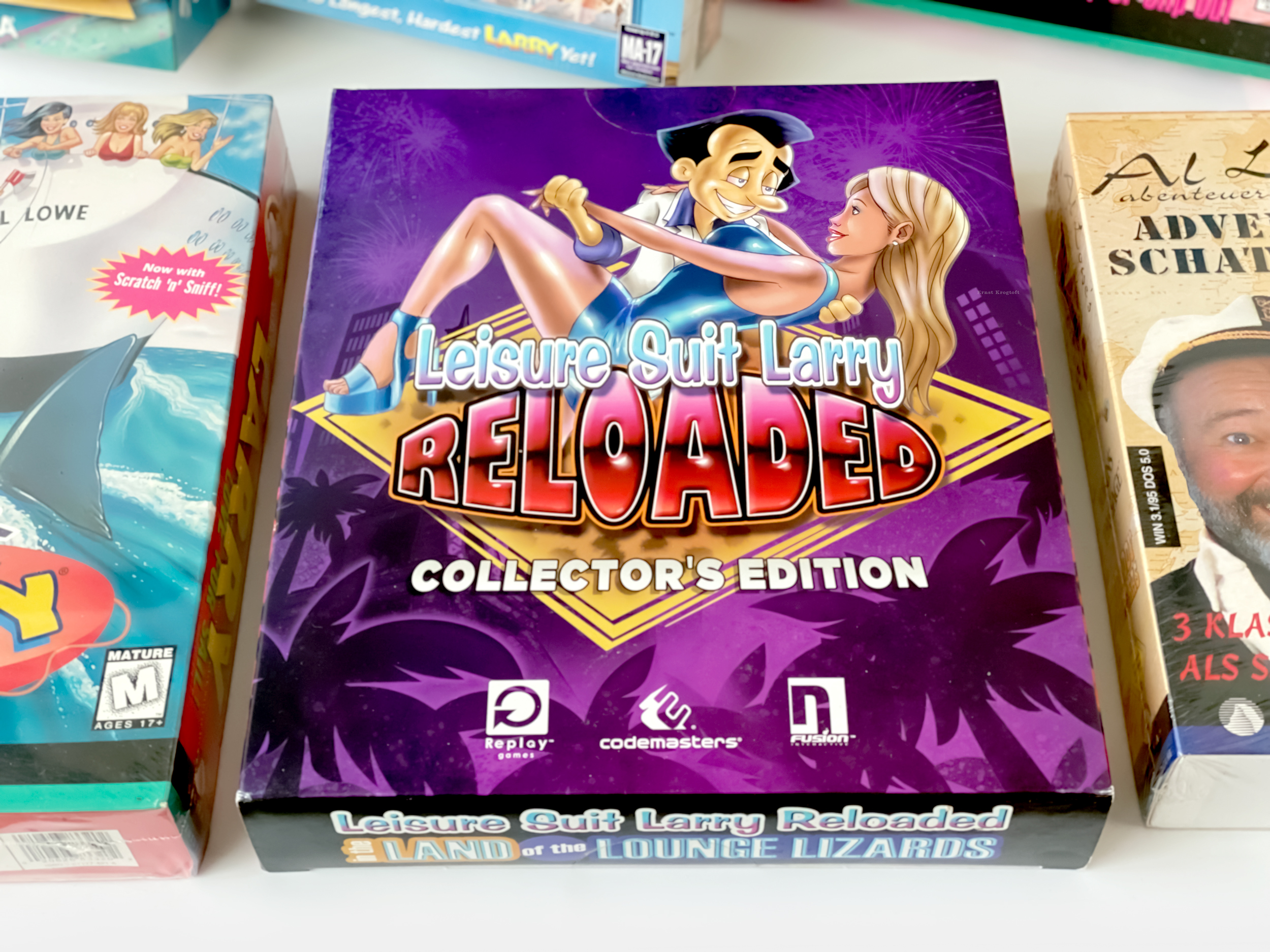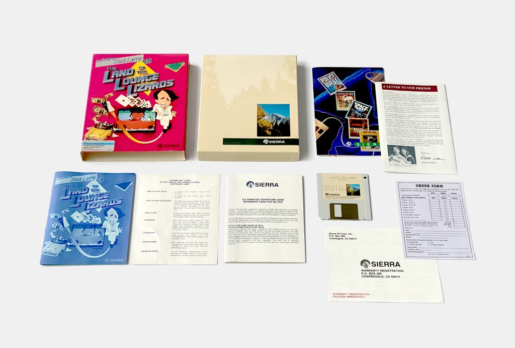On the left, Al Lowe’s personal copy, for the Apple II, which I acquired some years back. On the right, the 16-color EGA version for the IBM/PC, and on the bottom, the 1991 256 VGA release in the original pink box, only sold very briefly before it was released in a redesigned box