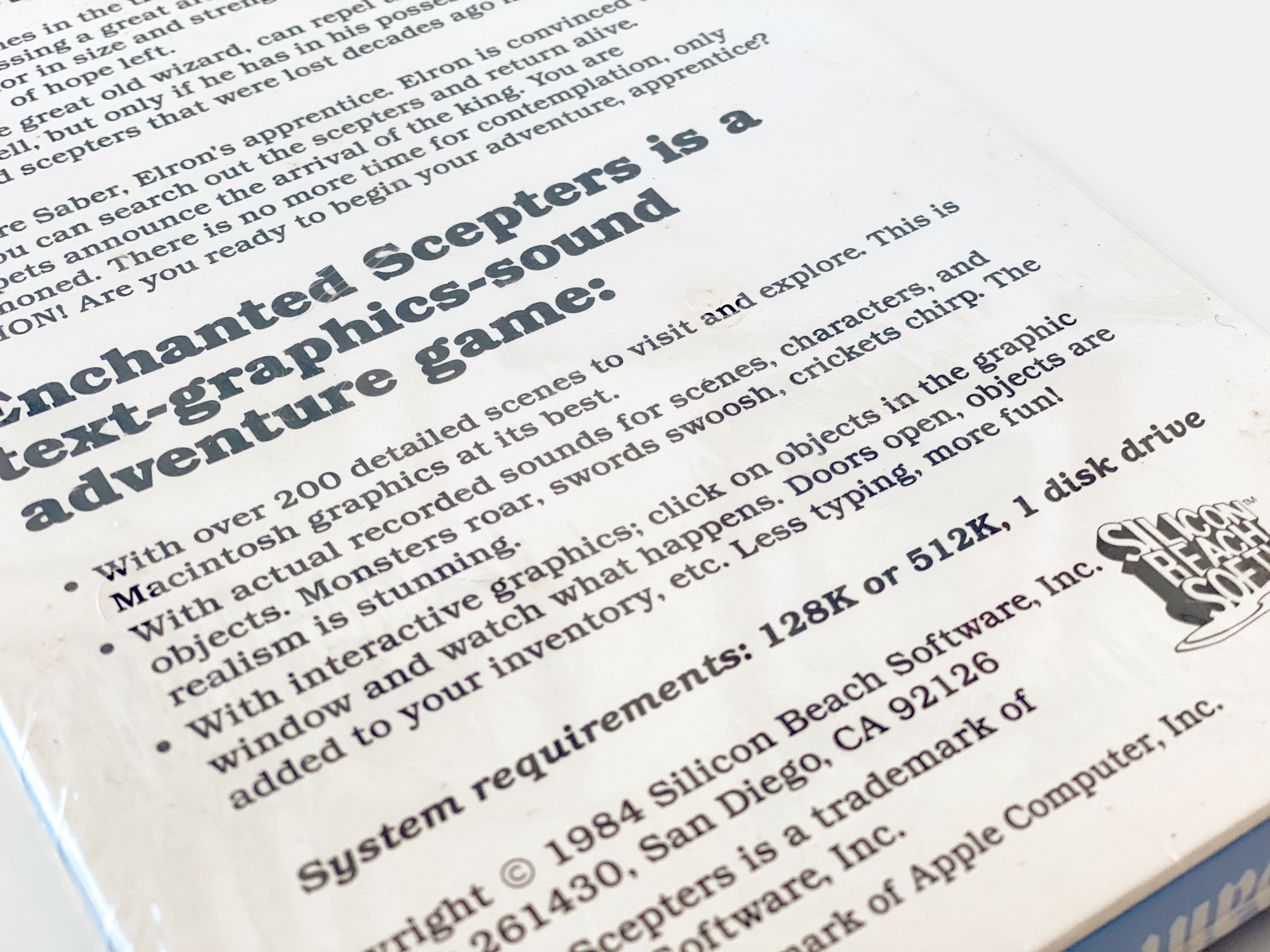 William Appleton’s Enchanted Scepters was published for the Macintosh by San Diego-based Silicon Beach Software. There’s some discrepancy on the actual release date but most evidence suggests it was published in 1985