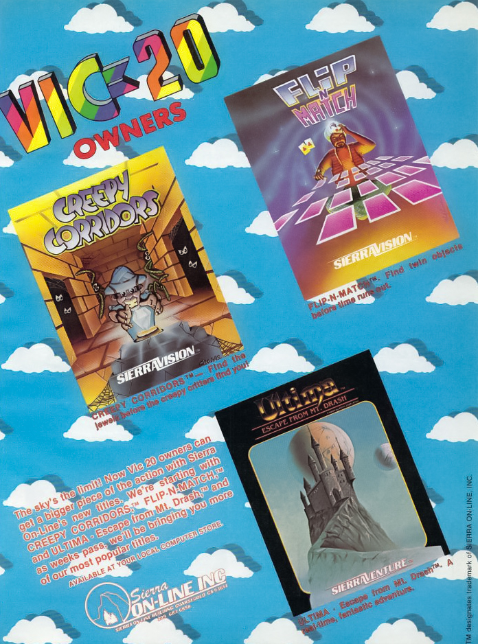 Back in 1980 Jack Tramiel, founder of Commodore International, as part of his philosophy, computers for the masses, not the classes, introduced the Commodore VIC-20, the first low-cost color computer available on the market. The $299 ($1000 in today’s money), user-friendly computer quickly became a best-seller and the first home computer to sell more than a million units. Producing games for the VIC-20 was tempting and fitted well within Sierra’s newly established SierraVision label, devoted, to action and cartridge-based games. But time was moving fast and by the spring of 1983, the VIC-20 software market was well beyond its heyday and now in rapid decline. Commodore’s latest offering, the Commodore 64, a vastly more capable machine quickly rendered the VIC-20 irrelevant and antiquated. Nonetheless, in the July 1983 issue of Compute! magazine, Sierra On-Line advertised three upcoming titles for the Commodore VIC-20. Among those, the infamous Ultima: Escape from Mt. Drash, considered by many the holy grail of computer games, Chuck Bueche’s Creepy Corridors, and Doug Whittaker’s Flip-N-Match.