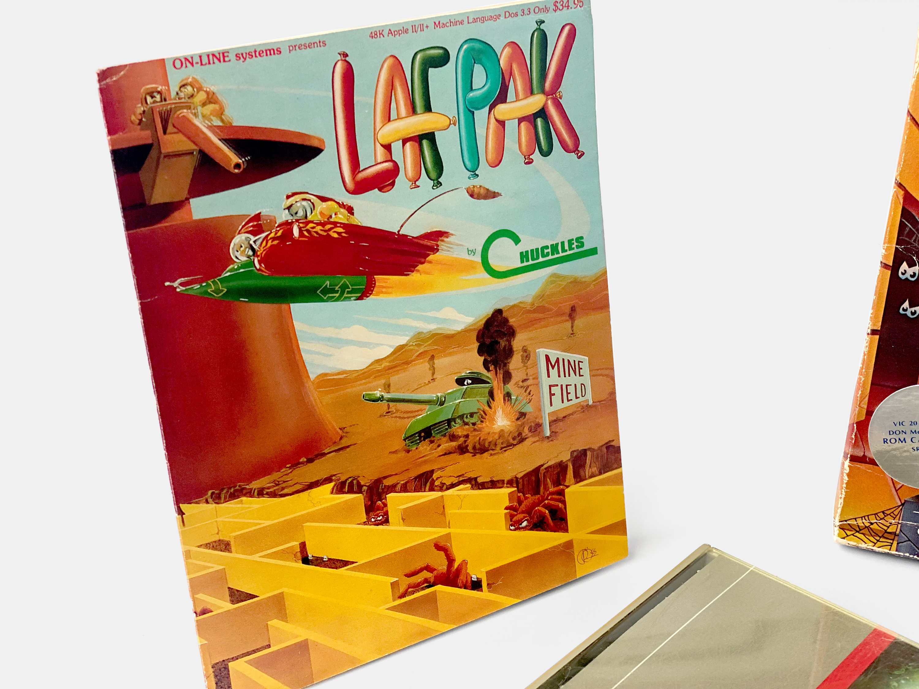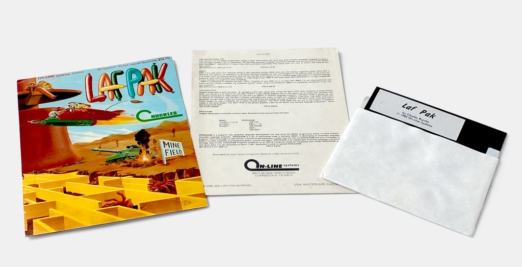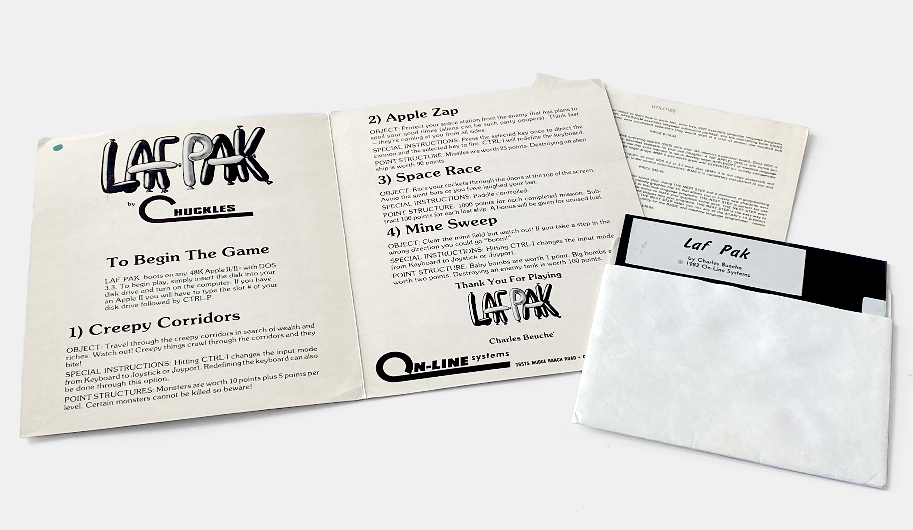 Chuck Bueche’s Laf Pak, a compilation of four small games was released for the Apple II in 1982 by Ken and Roberta Williams’ On-Line Systems.
