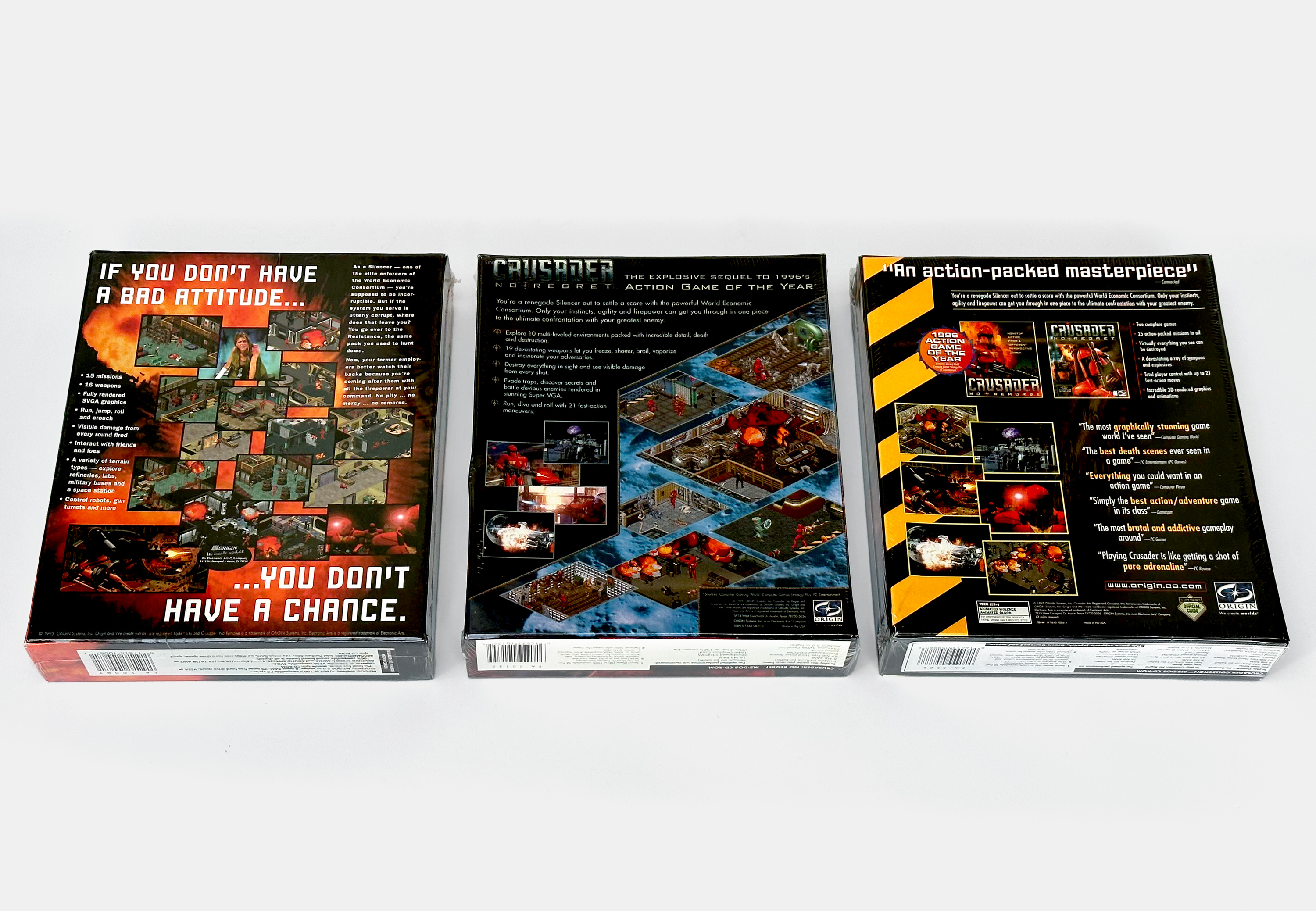 When Crusader: No Remorse was released, exclusively on CD-ROM, in 1995 it became one of the most action-packed and technologically impressive games released in the mid-’90s. Looking past the impressive visuals, the interactive and dynamic environments, and the action-packed gameplay, Crusader came with an elaborate storyline, featuring full-motion video sequences with live actors in cutscenes to create an engaging experience. It shipped with significant back-story materials, including a fold-out propaganda poster, newspaper, and guides from the tyrannical World Economic Consortium and the Rebel Resistance. The game was released as single-player only, though a cooperative multiplayer mode supporting up to four players was developed and included in the game up until its release.