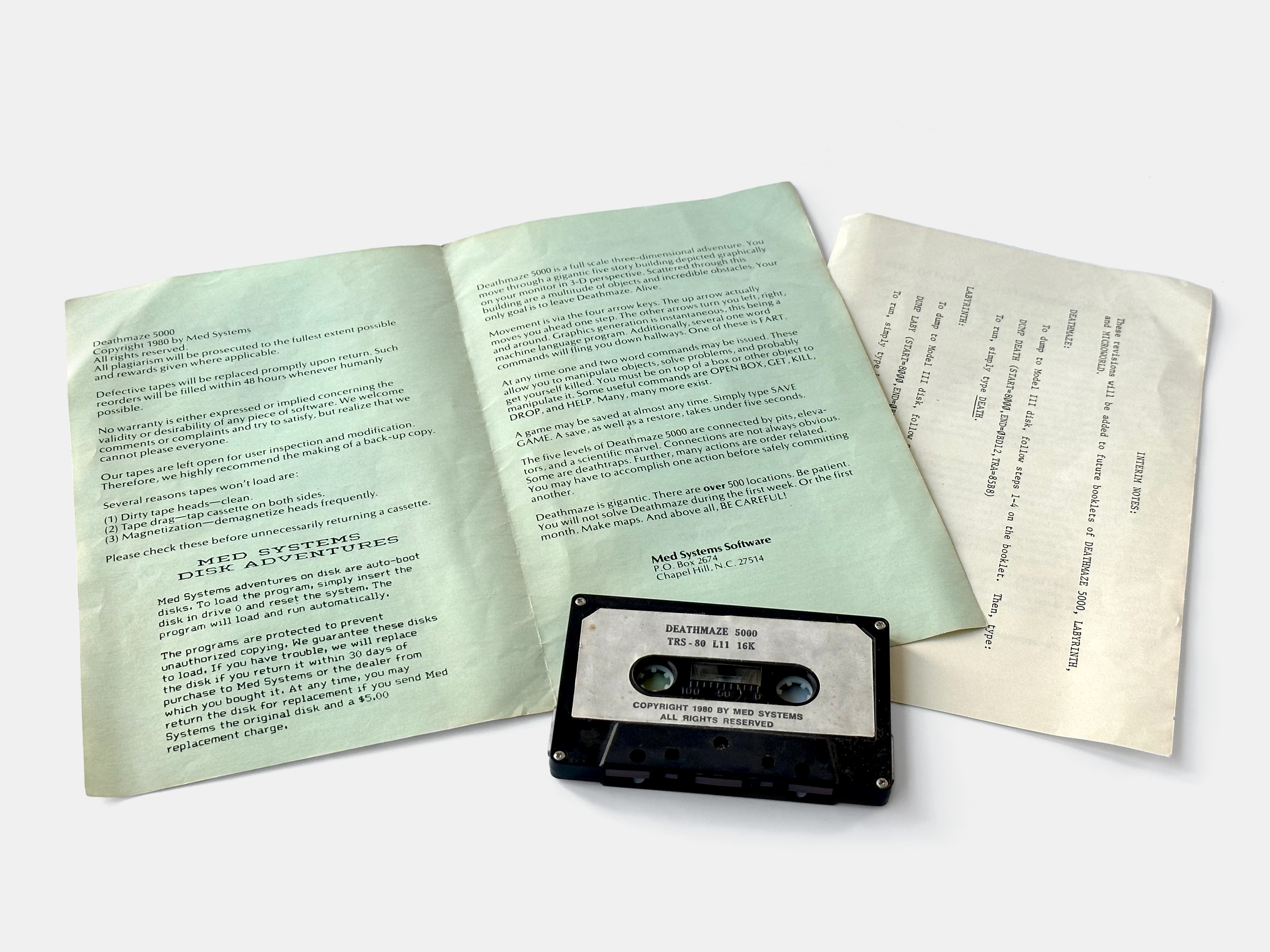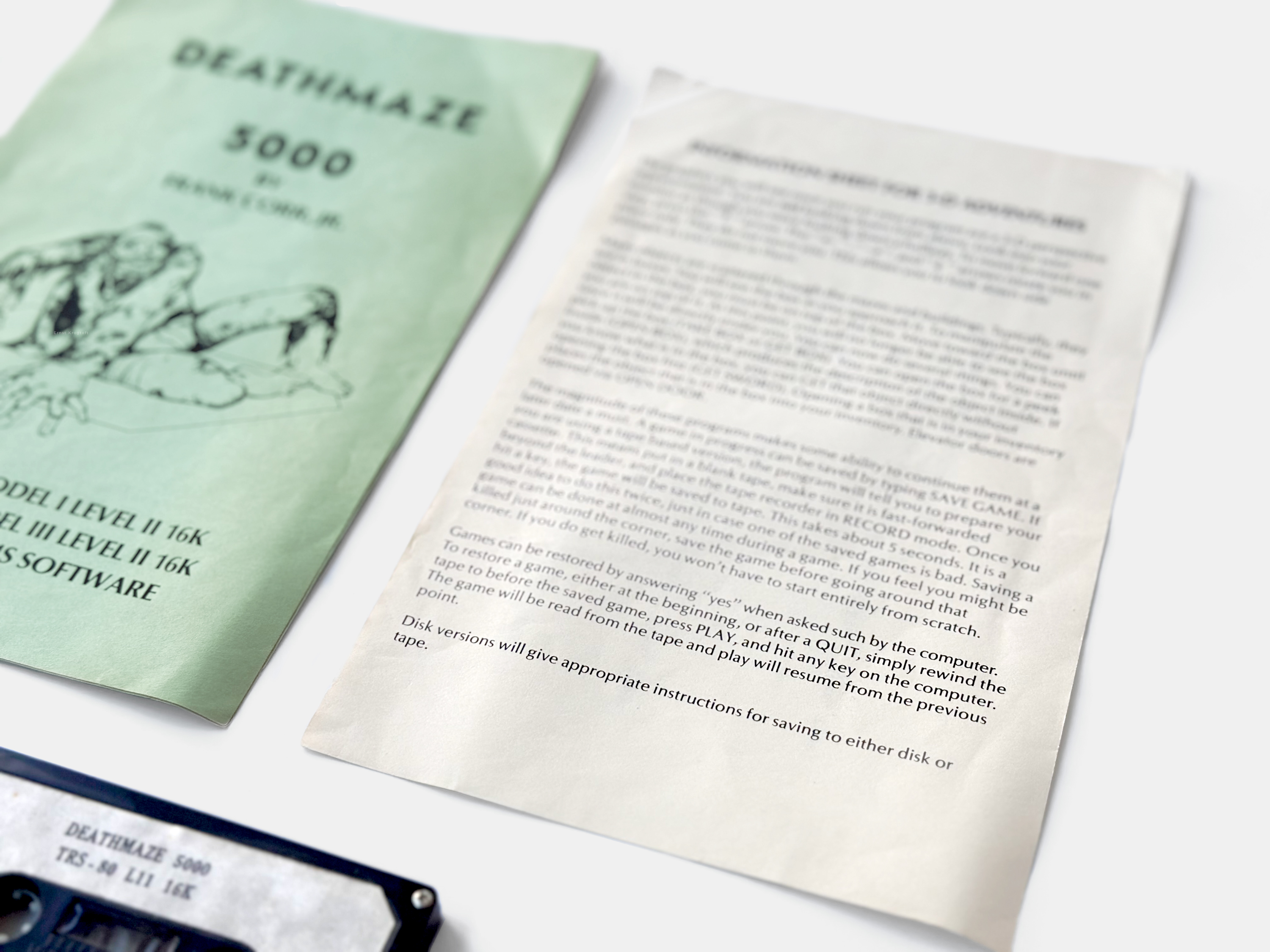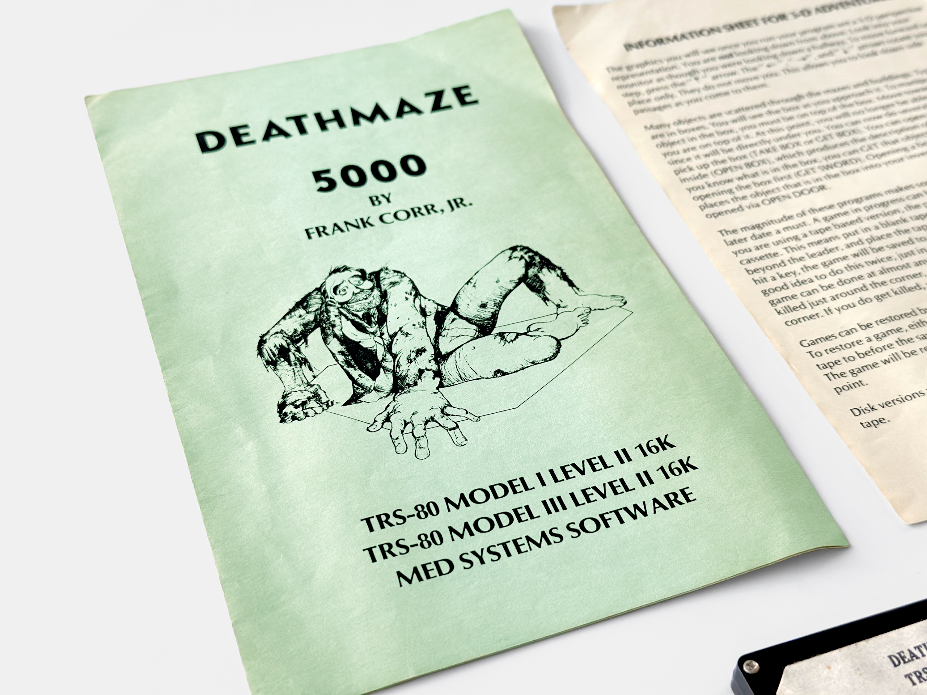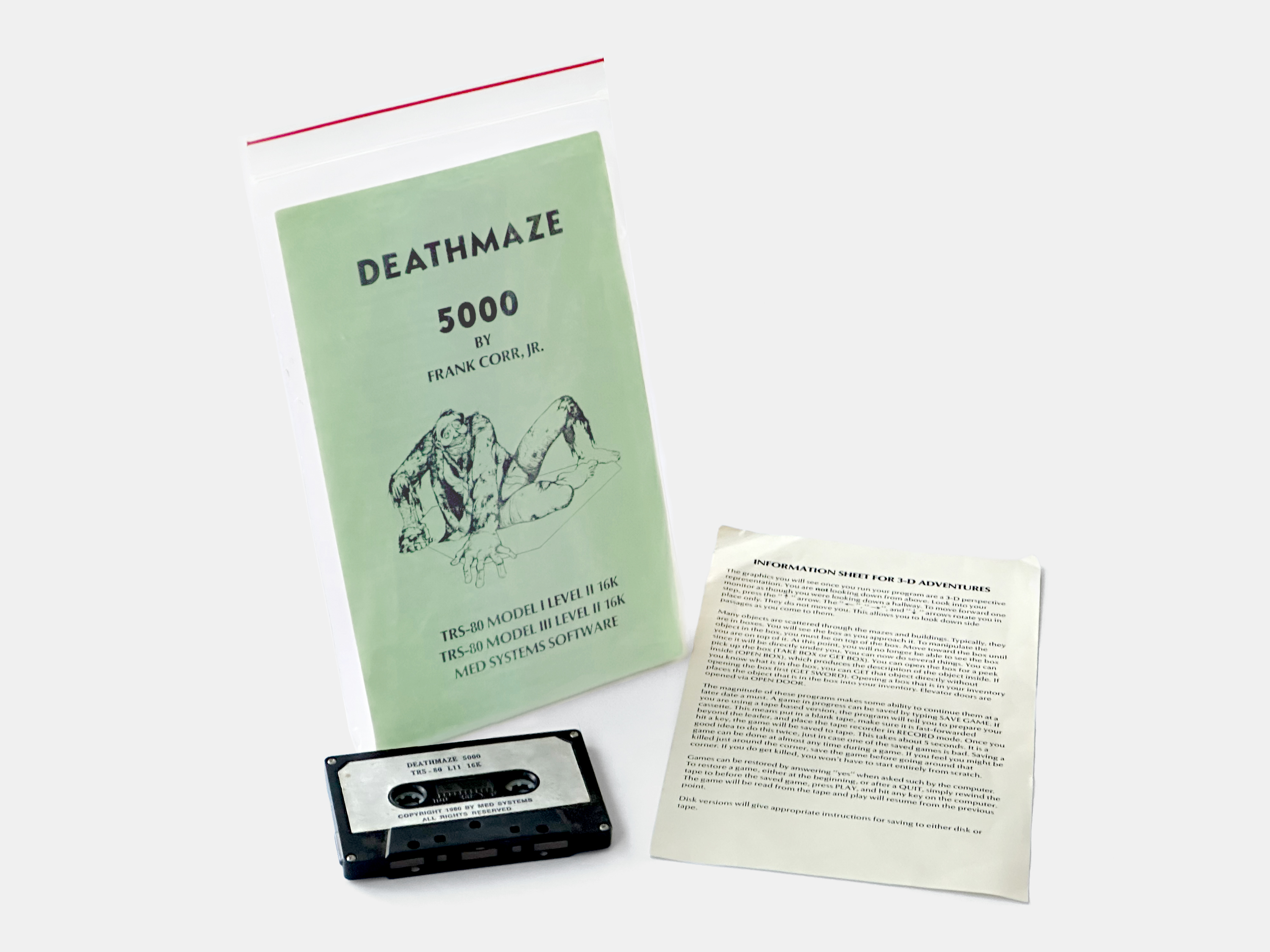 Frank Corr’s second game, Deathmaze 5000 was released by Med Systems Software for the TRS-80 in the autumn of 1980. It was later ported to the Apple II