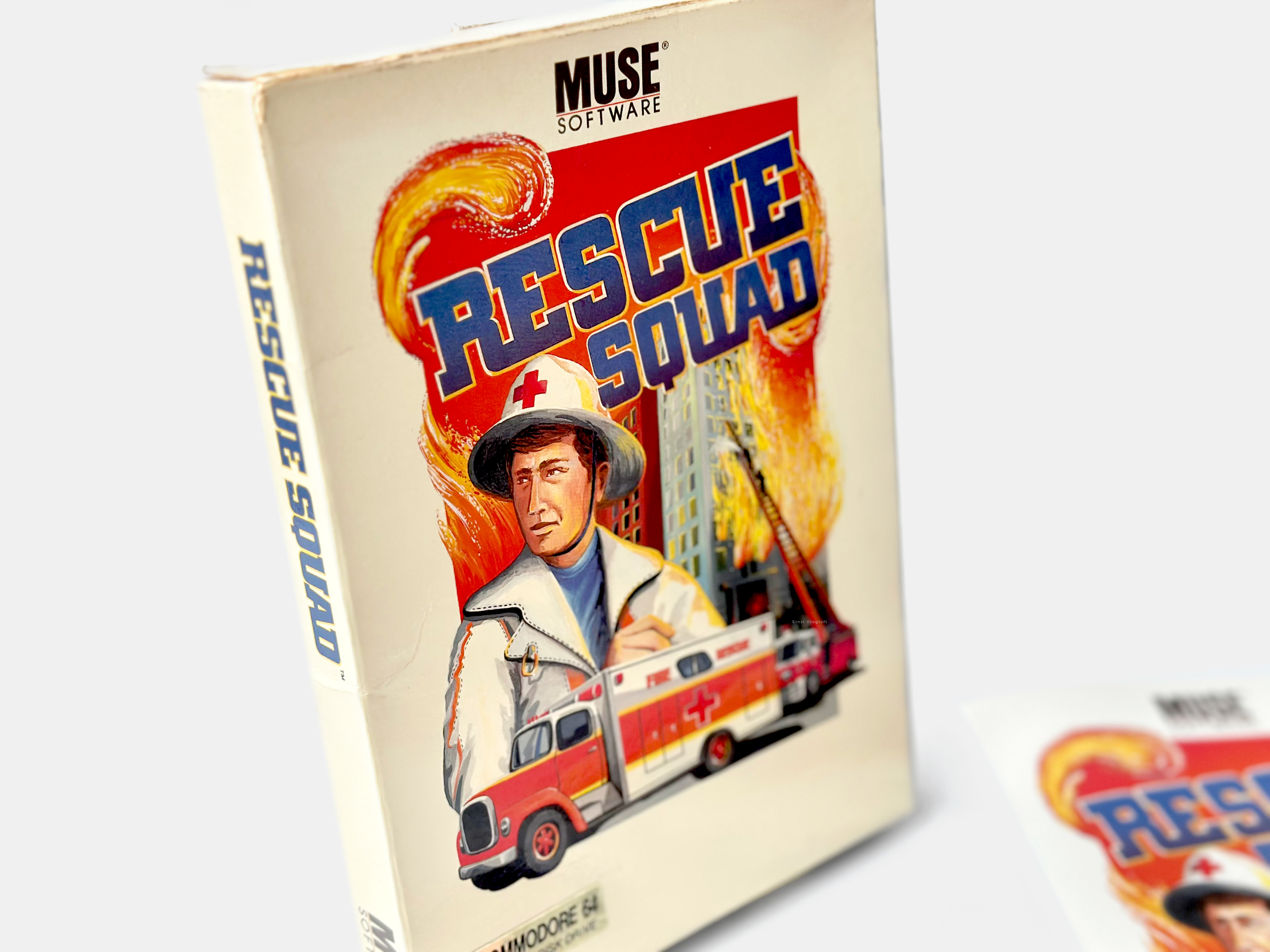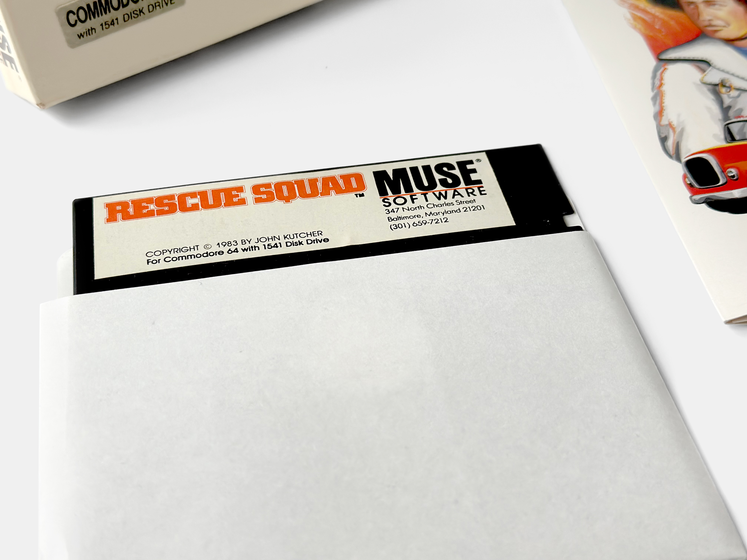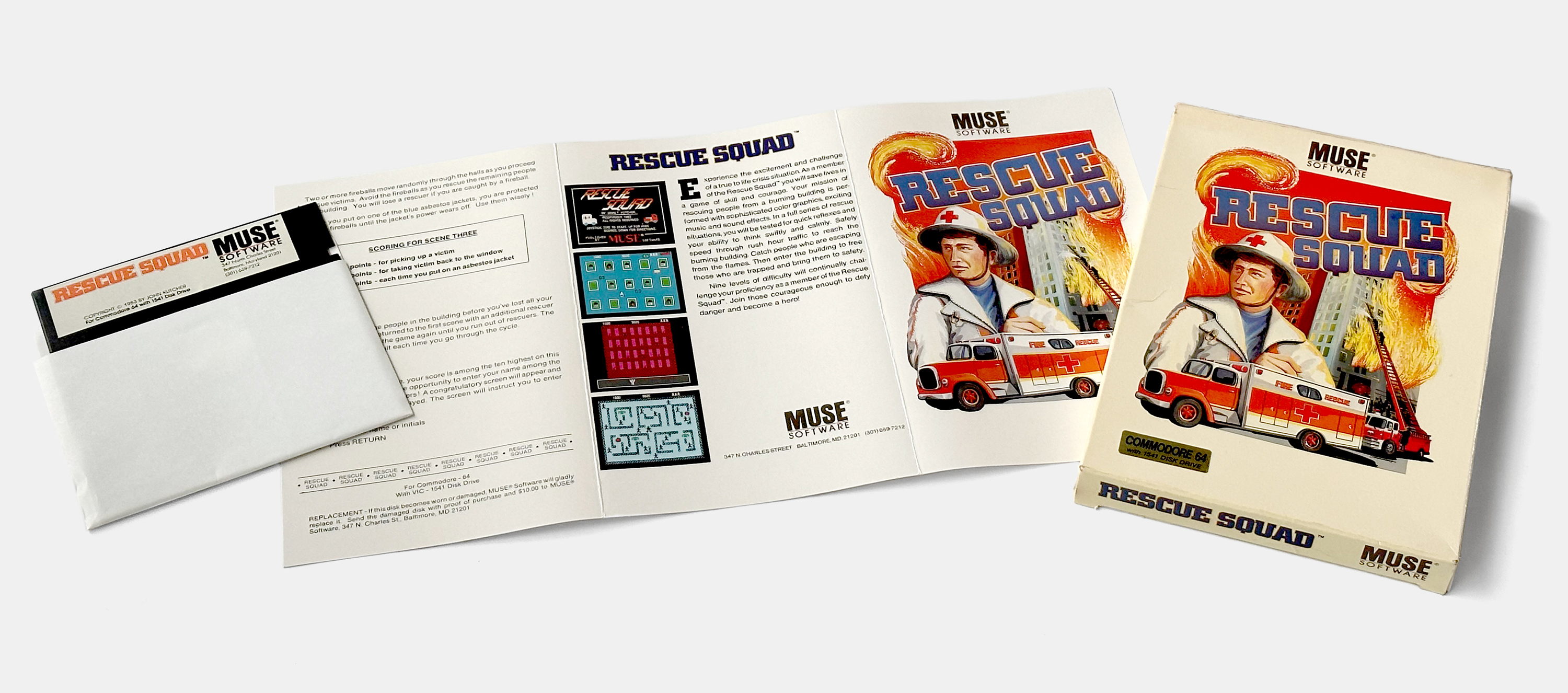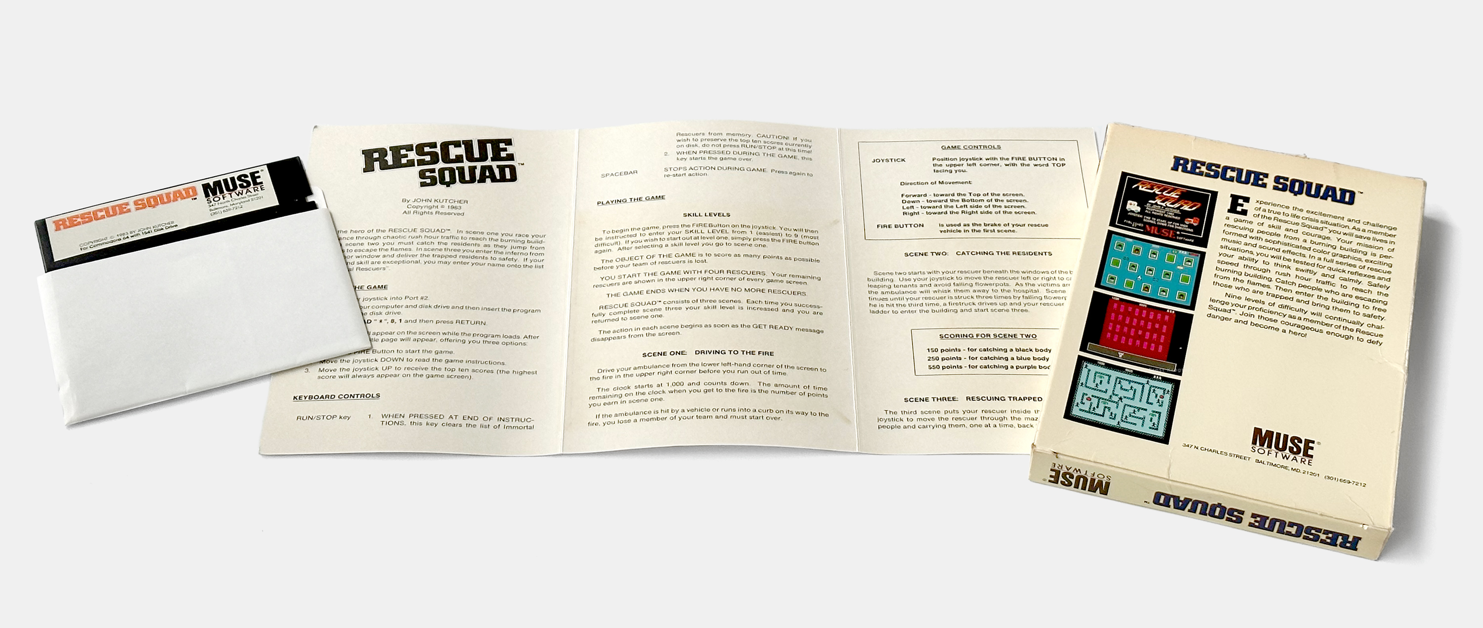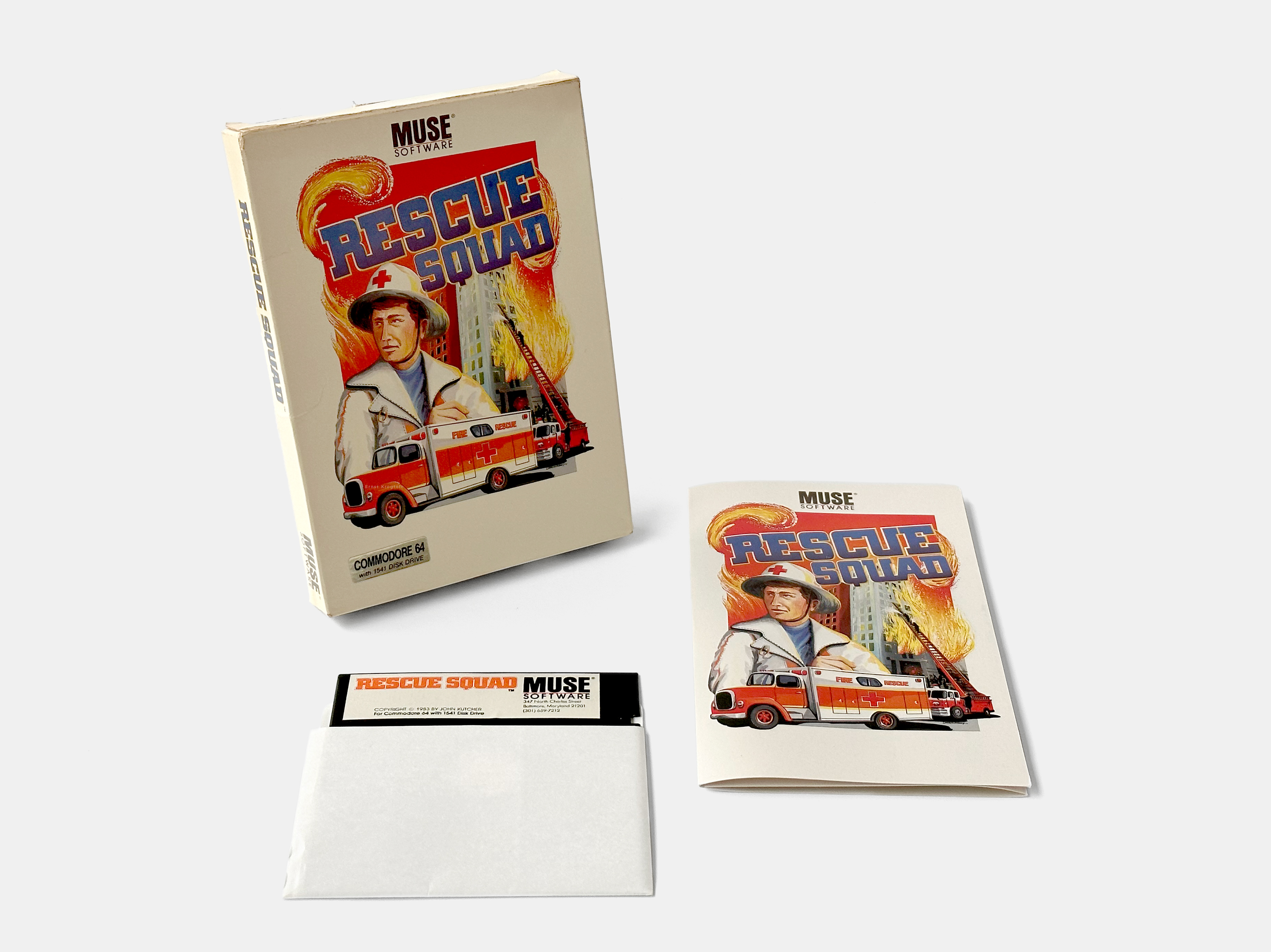 John Kutcher’s first commercially released game, Rescue Squad, published by MUSE Software for the Commodore 64 in 1983