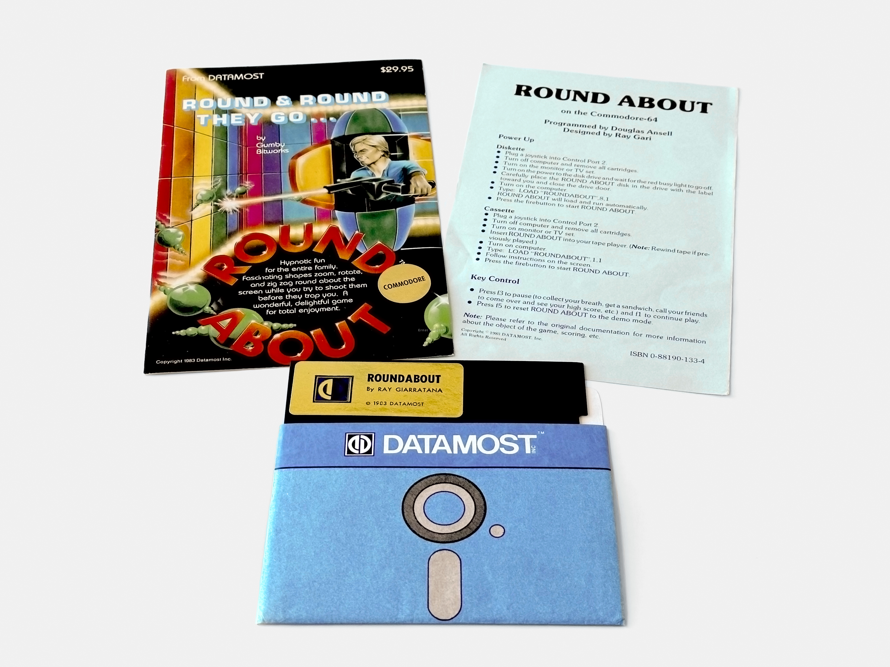 Diving into 6502 Assembly programming on the Apple II while trying to crack popular games of the times soon turned into fully-fledged game development. In 1983, while working on his abstract space shooter, Roundabout, Giarratana sent out an early version to Jerry Jewell of Sirius Software who showed interest in helping complete it and publish it. For a few months, he worked with Sirius but when the game neared completion Jewell changed his mind and Giarratana had to try his luck with other publishers. Doug Carlston of Brøderbund liked it but had a somewhat similar game in the pipeline. Eventually, he got in touch with Dave Gordon of Datamost who picked it up and published it for the Apple II, Atari 8-bit, and Commodore 64 in 1983