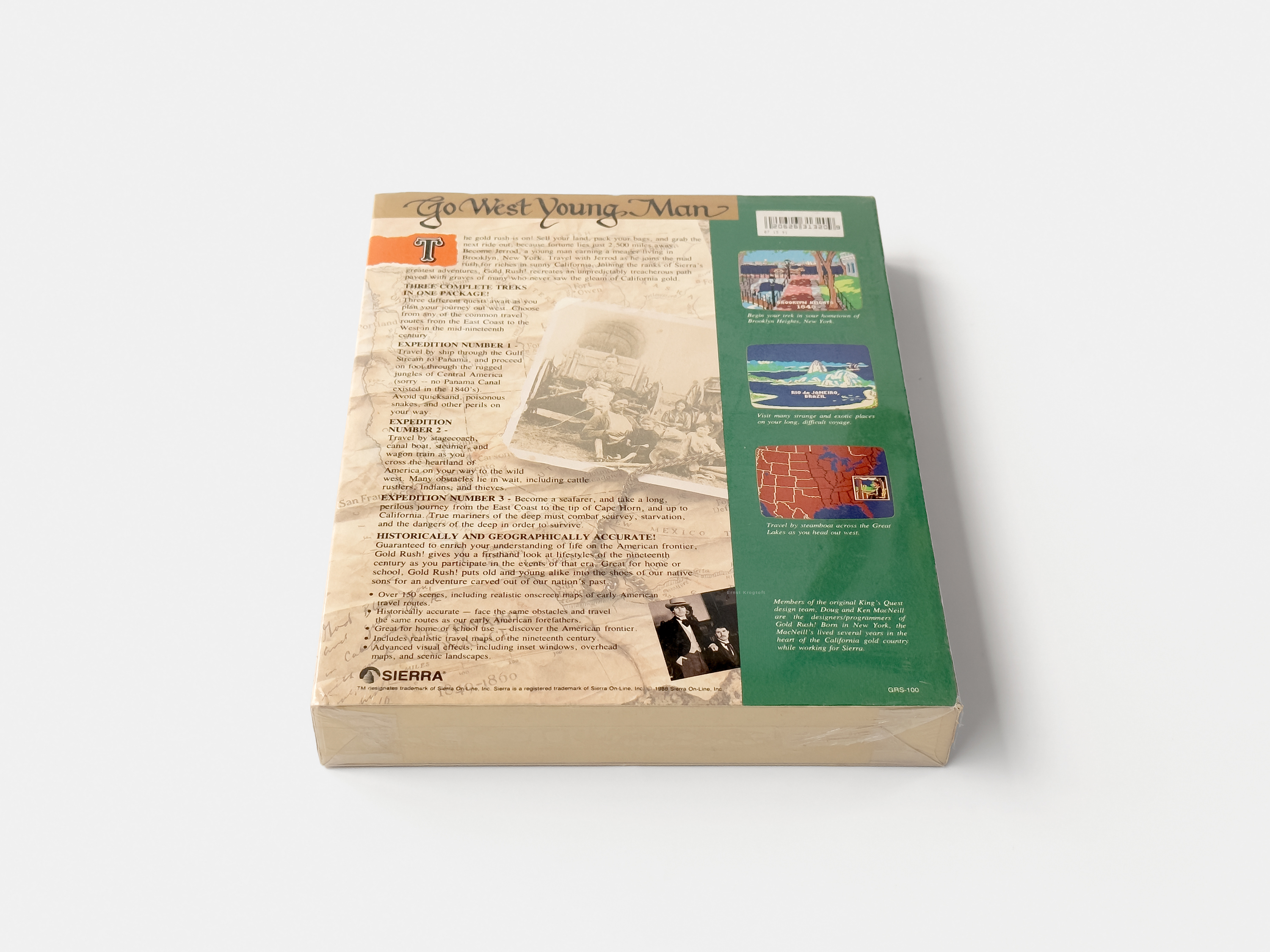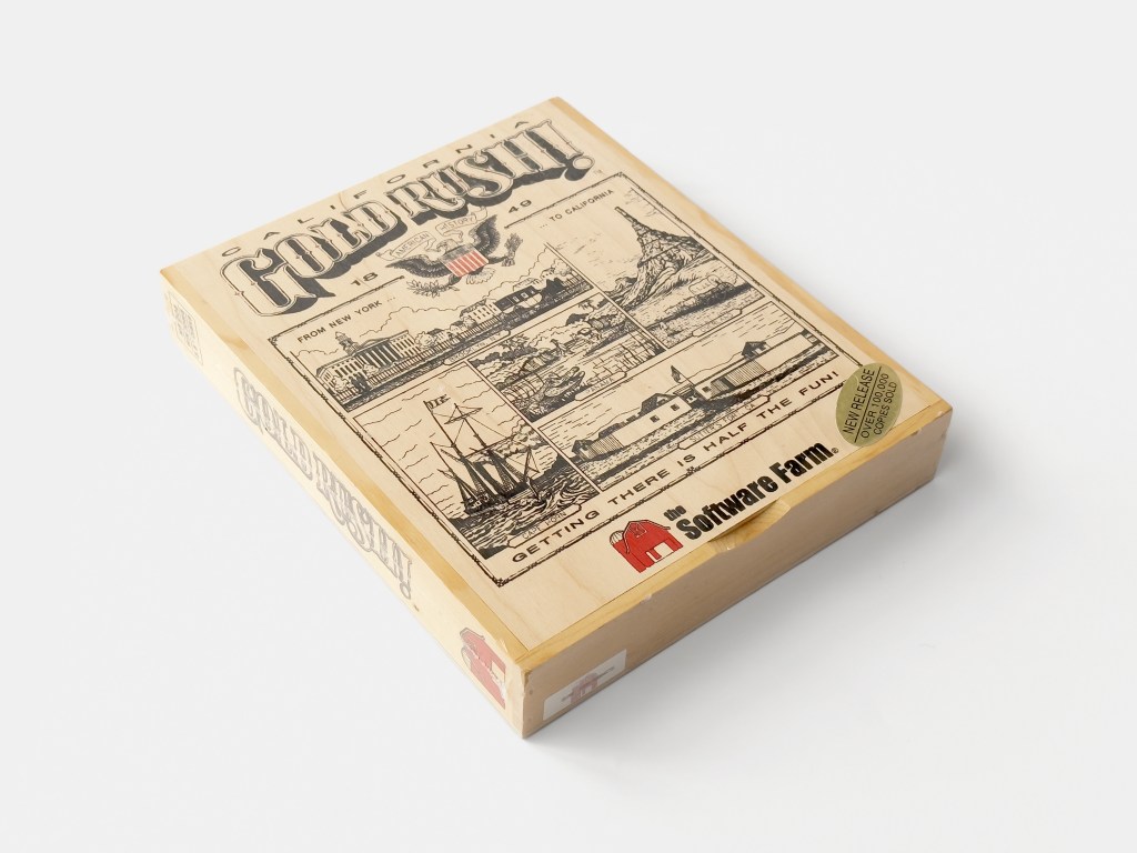 Any mention of Sierra in the game was removed and the text and graphics were reworked. Gold Rush! now brushed up was published as California Gold Rush! by the brother’s company The Software Farm in 2000. Two versions were being offered, an economy version distributed in an envelope and a collector’s edition in a beautiful handmade wooden box.