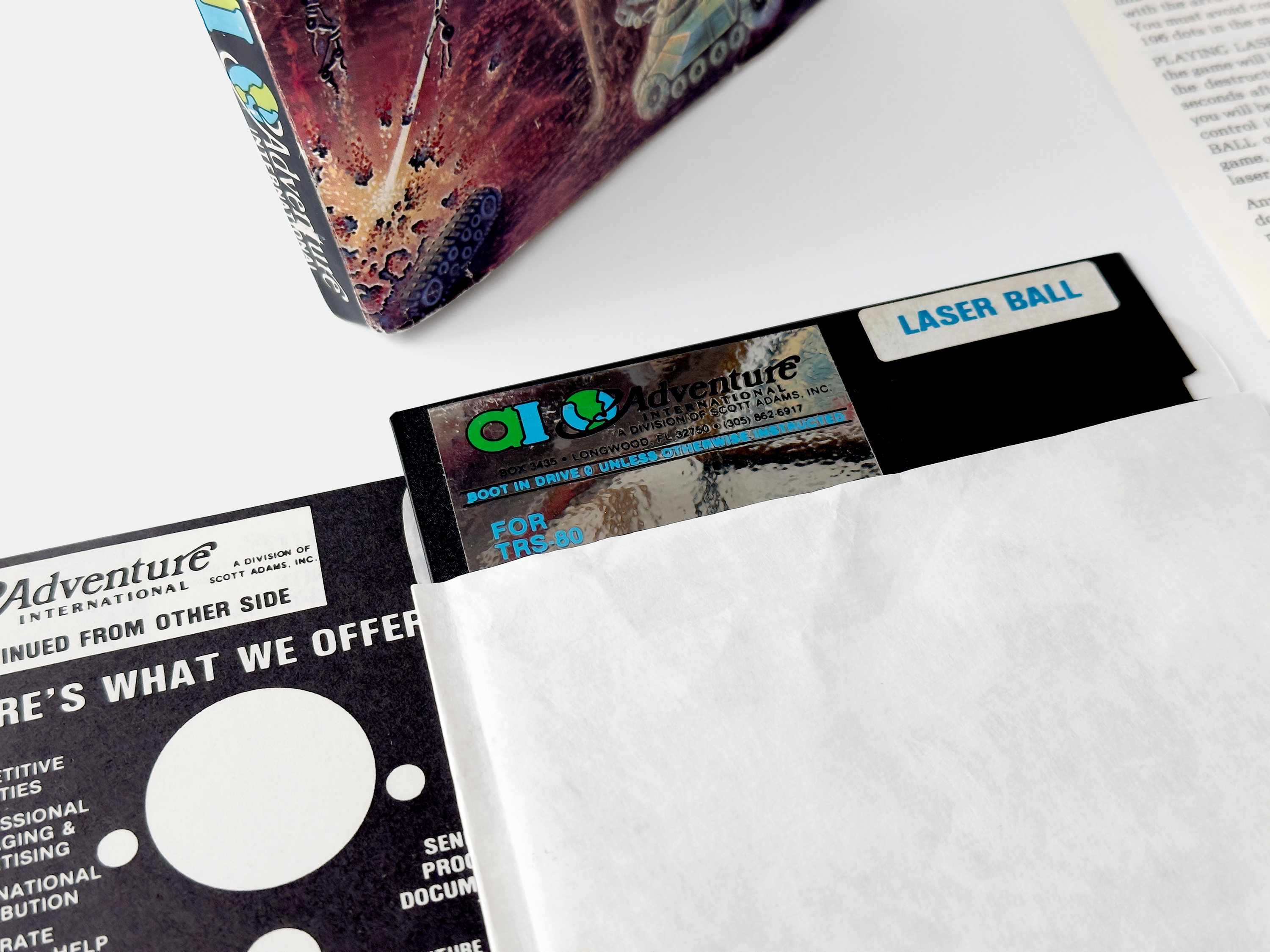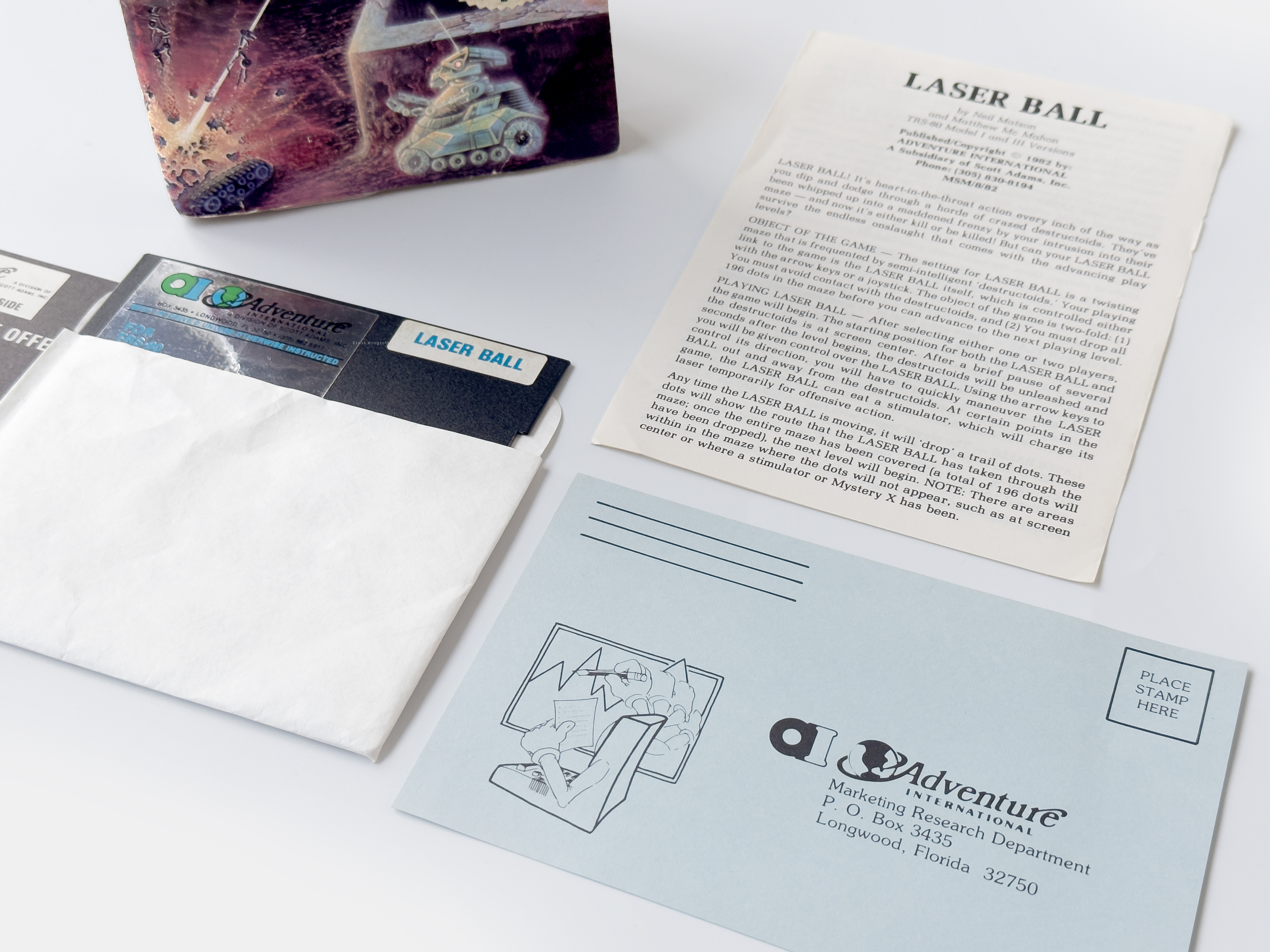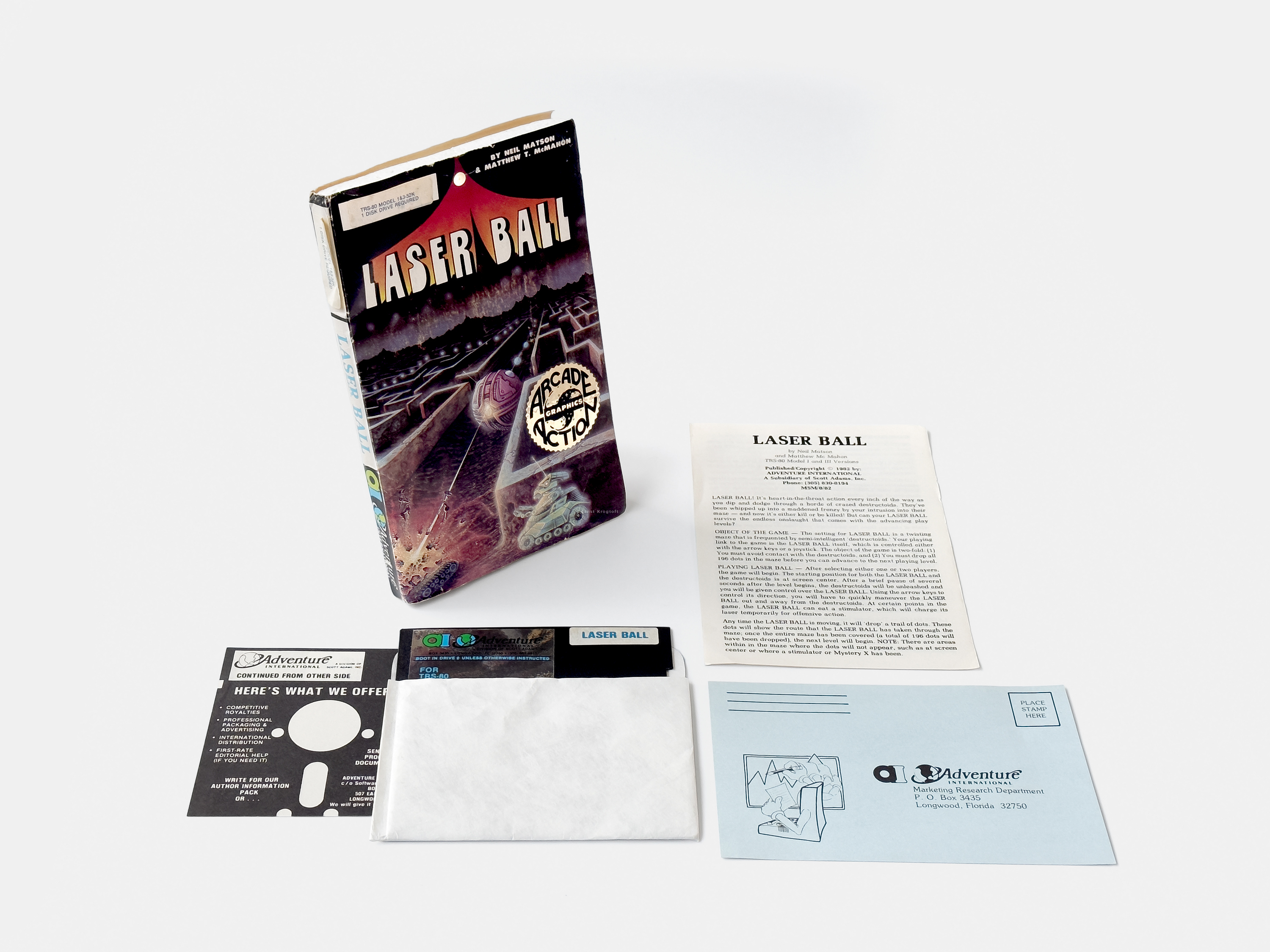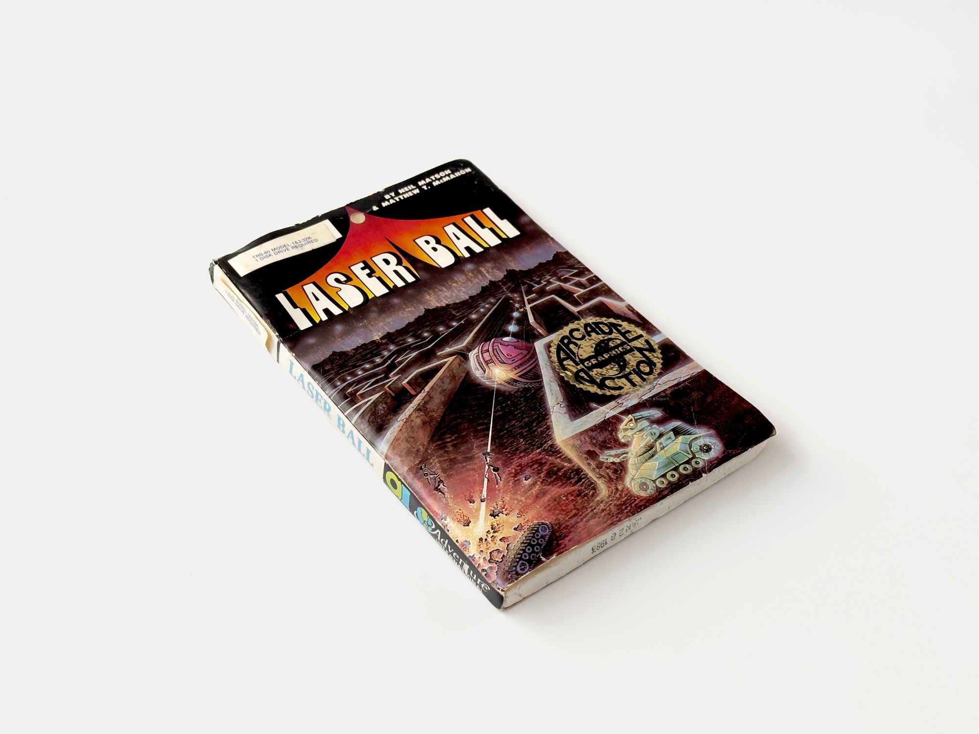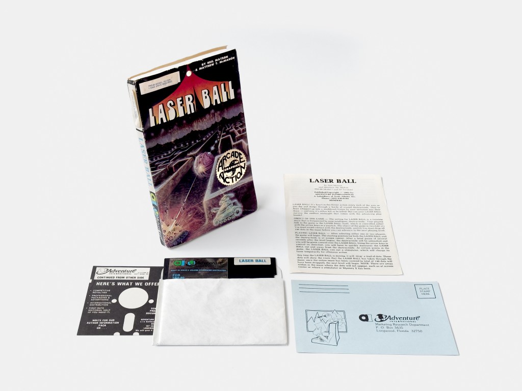 Neil Matson and Matt McMahon’s Pac-Man variant, Laser Ball was picked up by Adventure International and released on floppy and cassette for the TRS-80 in 1982