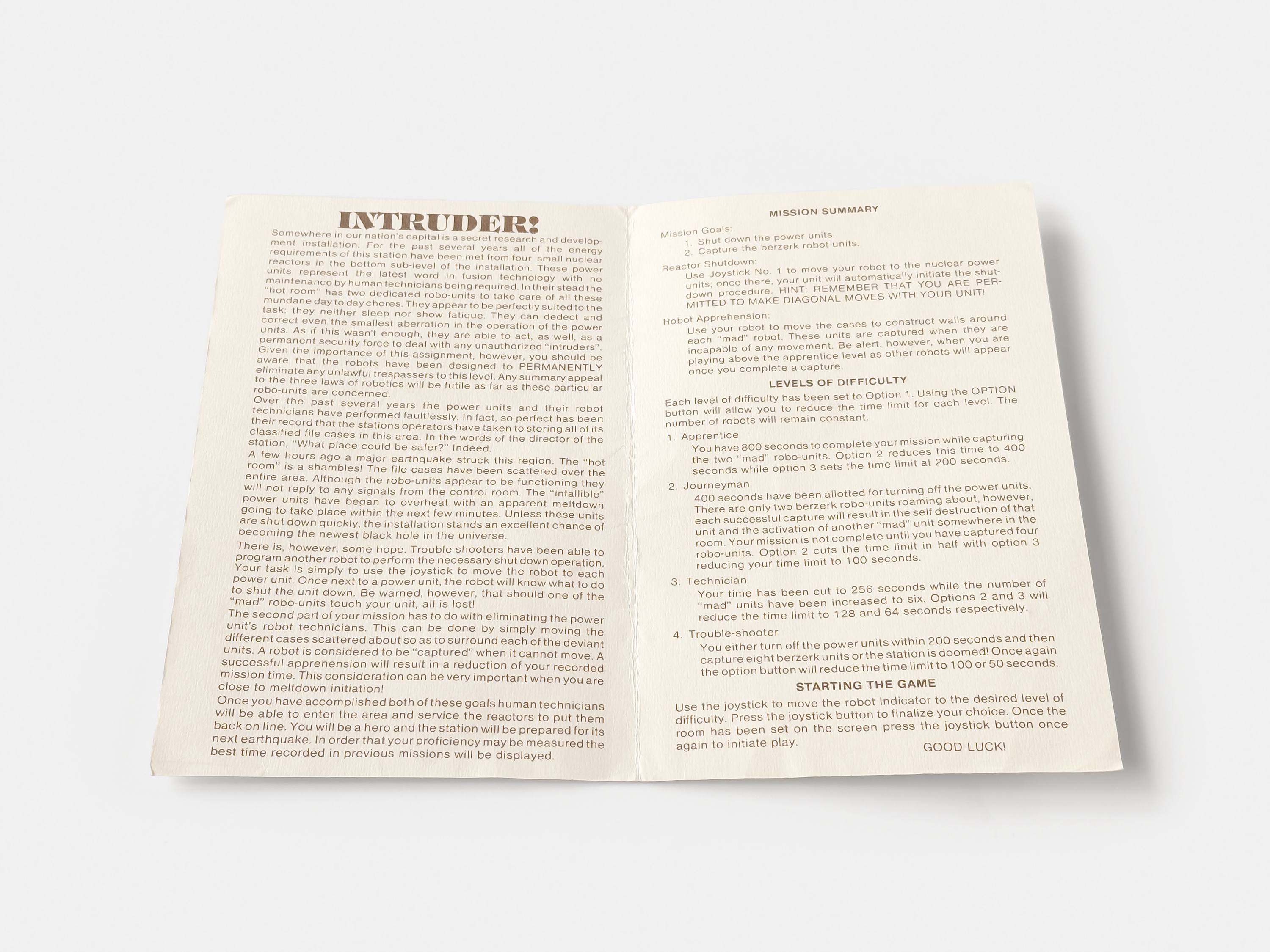 Created by John cope and William Morris, who together had created a few very simple BASIC games, published for the Atari 8-bit in 1981 by Softside Magazine. Intruder! is a 1-player arcade game where the player must shut down a number of nuclear reactors and try and capture the robots gone mad by constructing walls from the moveable cases scattered throughout the factory floor, all before they catch you or the time runs out and everything blows to smithereens. The game was published in 1982 for the Atari 400/800 on disk and cassette by Inhome Software Incorporated, a small publishing business owned by Electronic Playworld, a chain of electronic stores in Toronto, Canada.