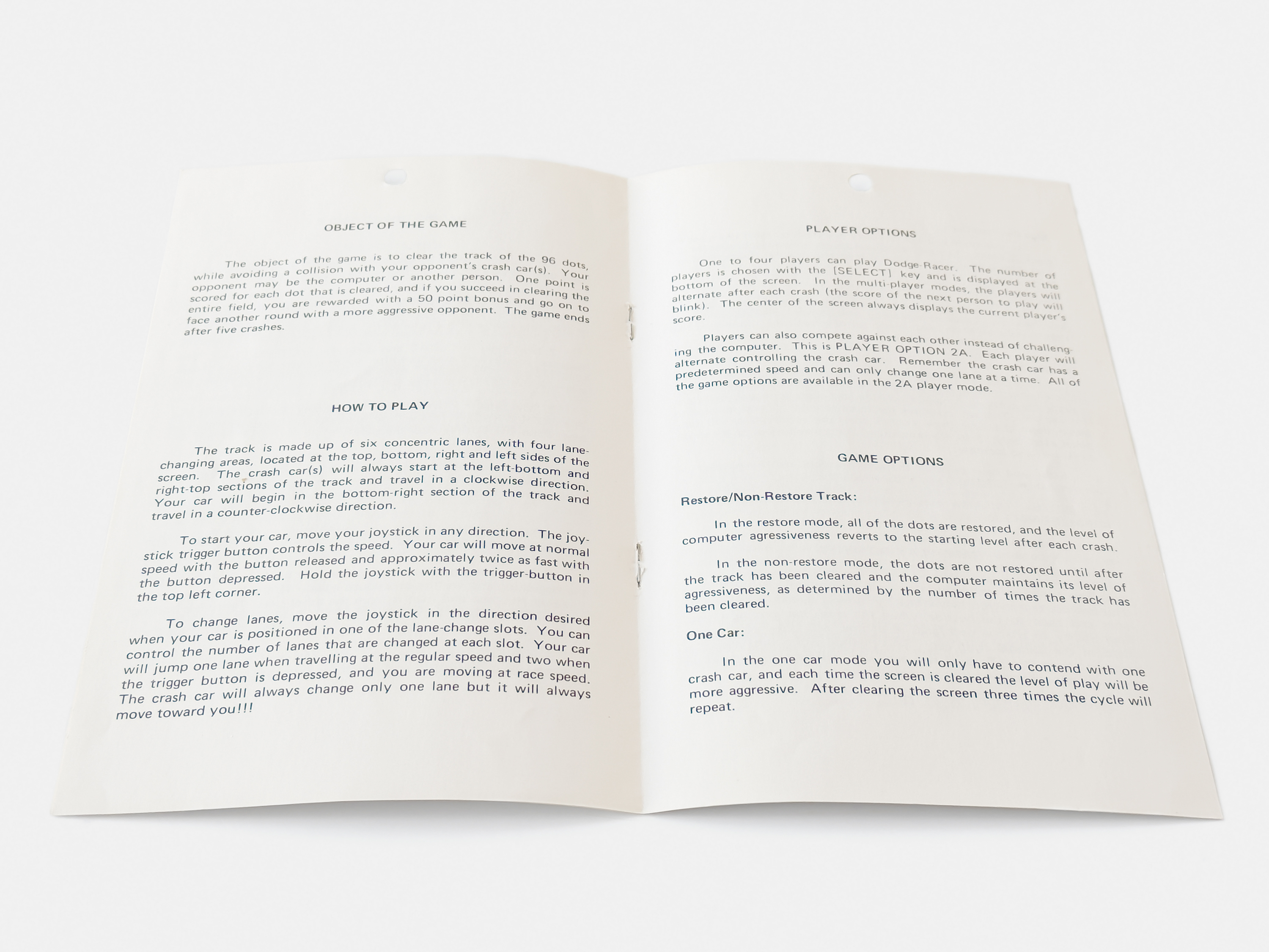 With your racecar, pick up all the dots in the six-lane maze while avoiding the crash-car going in the opposite direction. The concept was simple and had been proven successful with Sega Gremlin’s video arcade game Head On from 1979.