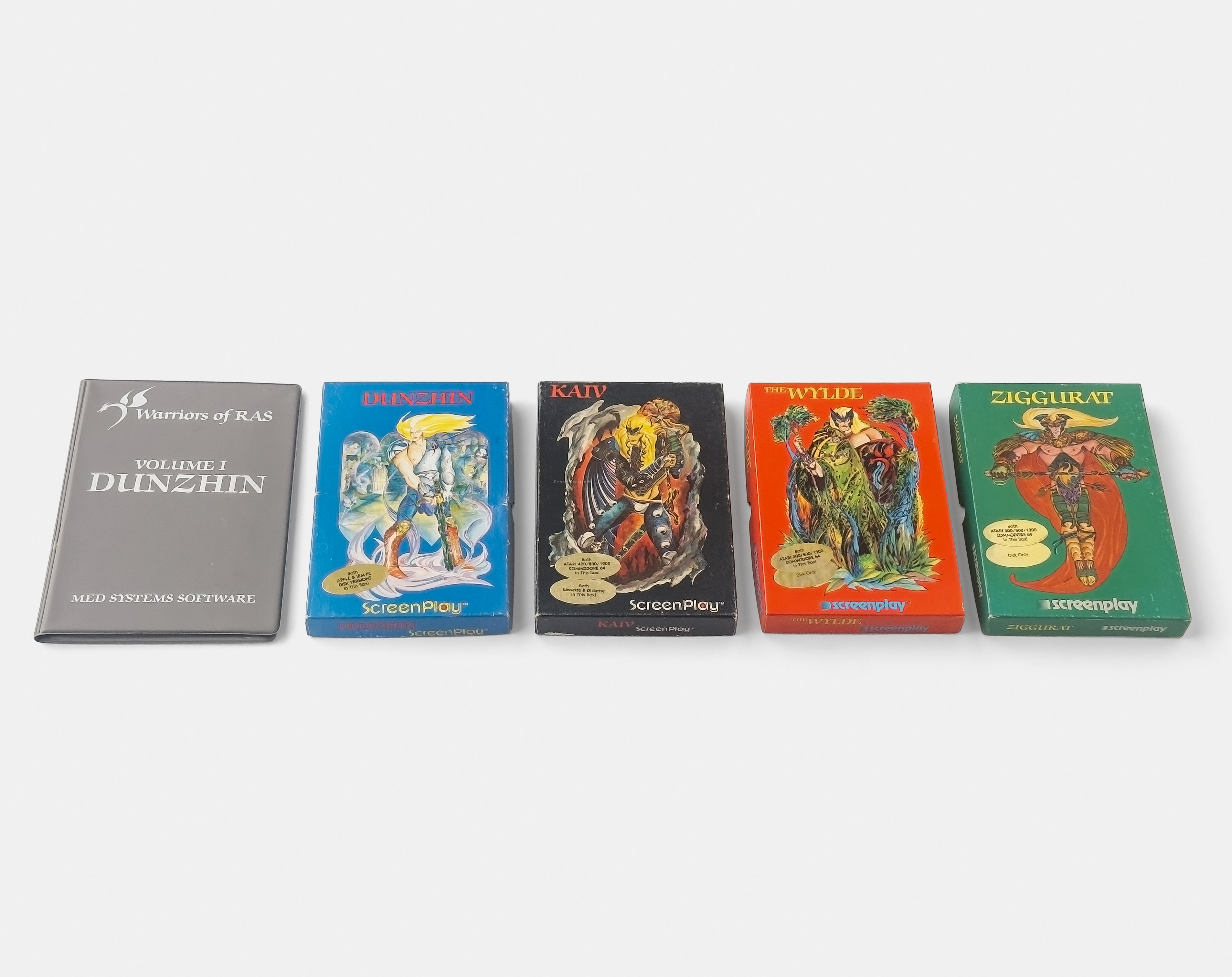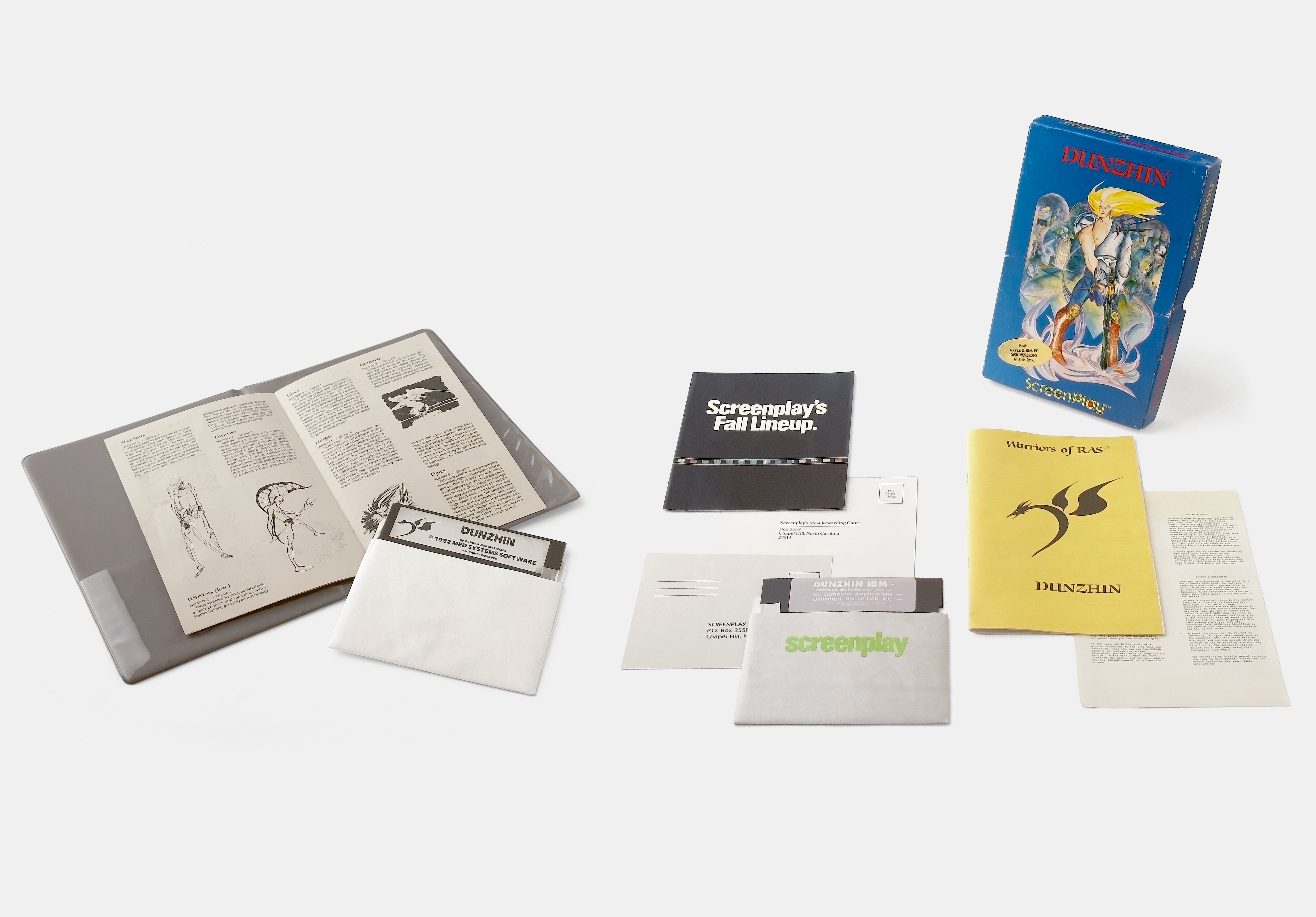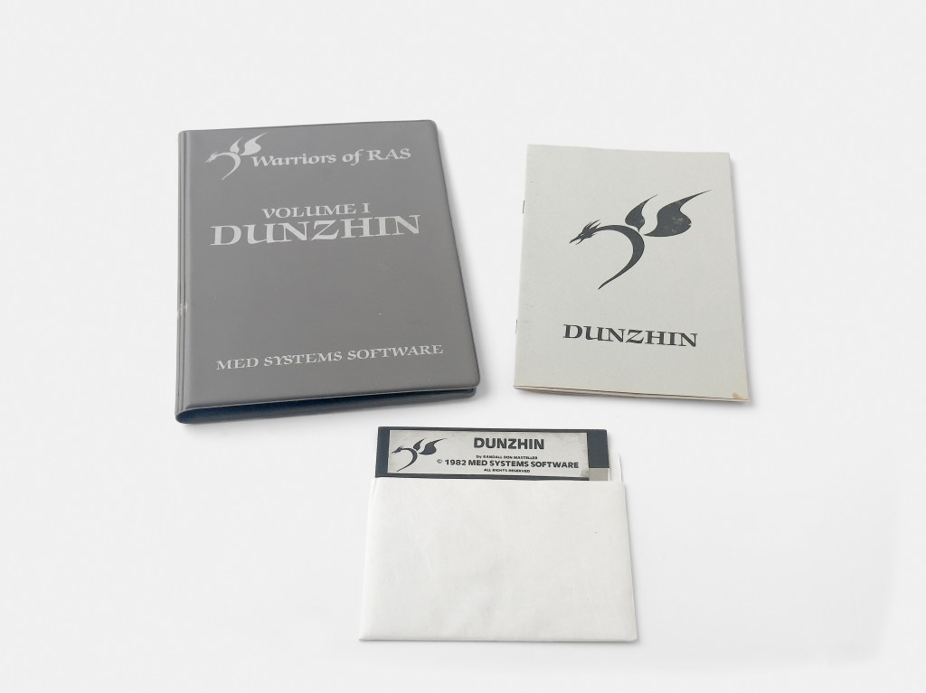 Dunzhin (dungeon), the first title in Randall Don Masteller’s Warrior of Ras series was initially released by Med Systems Software for the TRS-80 in 1982, in a grey binder (top and left). The same year Med Systems was acquired by Screenplay, a division of Intelligent Statements, and the title was rereleased for the Apple II, Atari 8-bit, Commodore 64, and IBM PC (right).