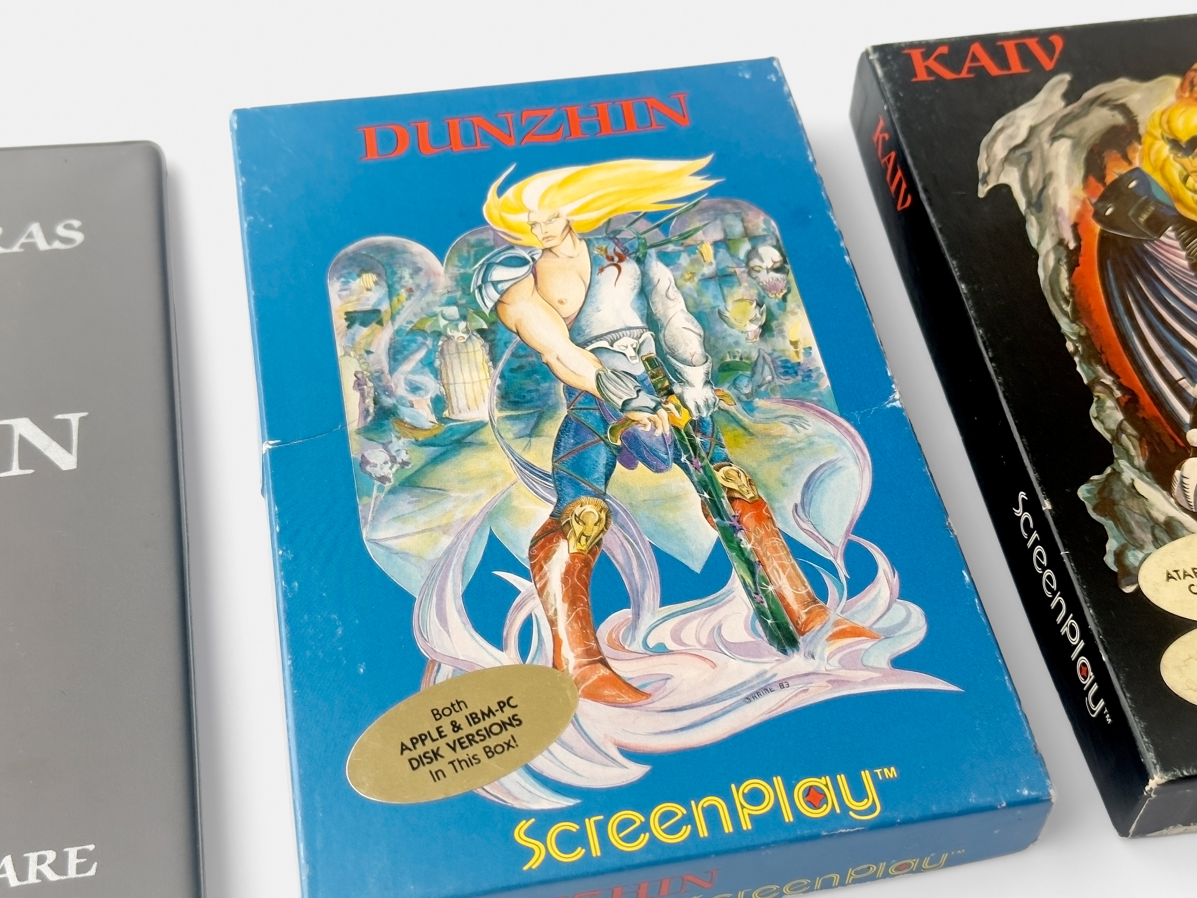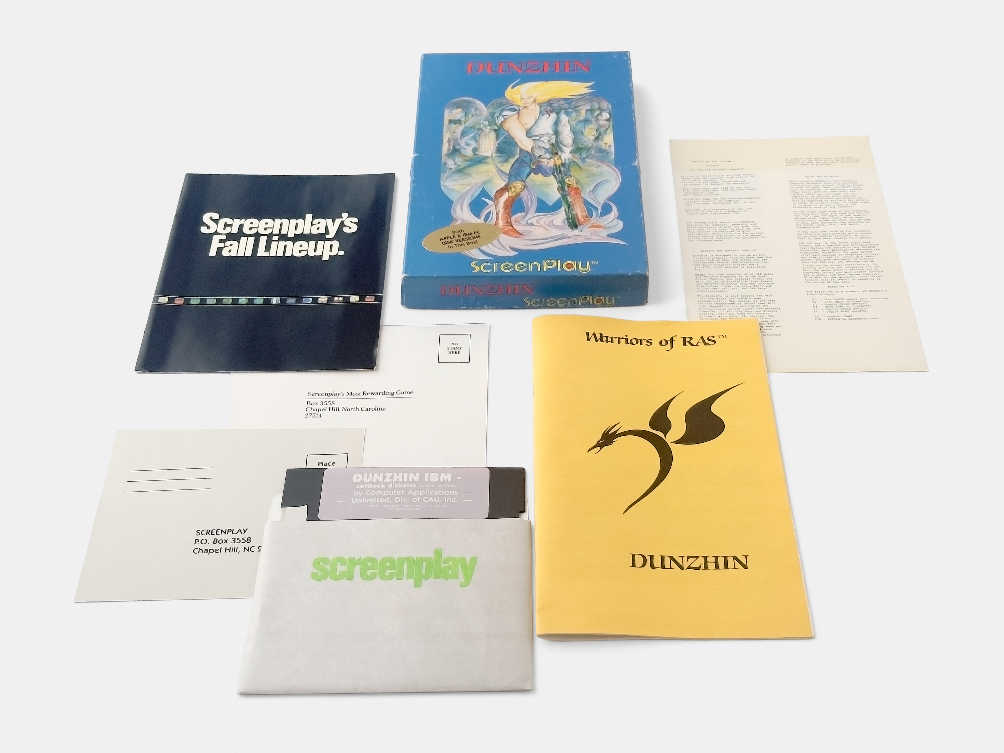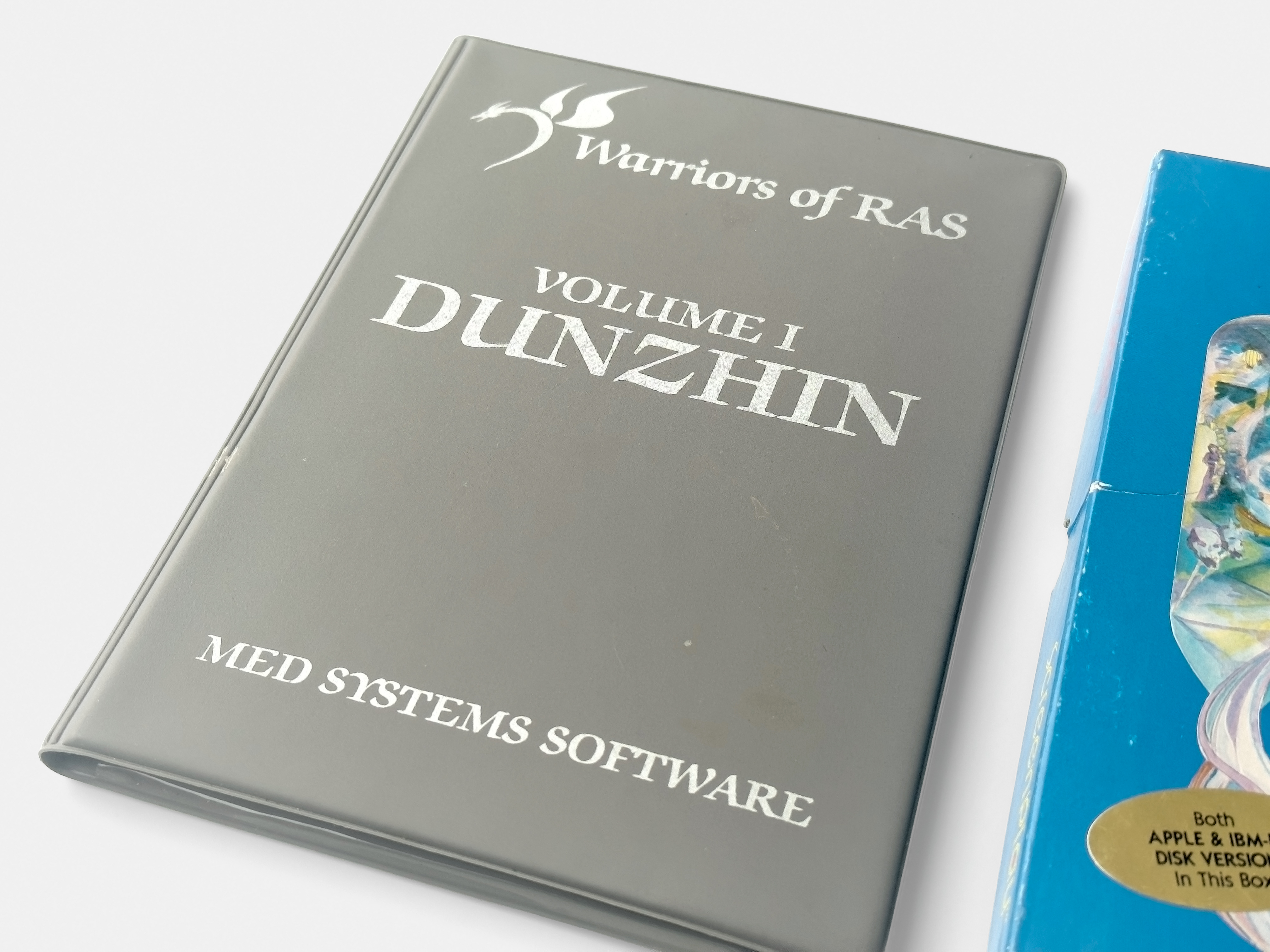 Dunzhin (dungeon), the first title in Randall Don Masteller’s Warrior of Ras series was initially released by Med Systems Software for the TRS-80 in 1982, in a grey binder (top and left). The same year Med Systems was acquired by Screenplay, a division of Intelligent Statements, and the title was rereleased for the Apple II, Atari 8-bit, Commodore 64, and IBM PC (right).