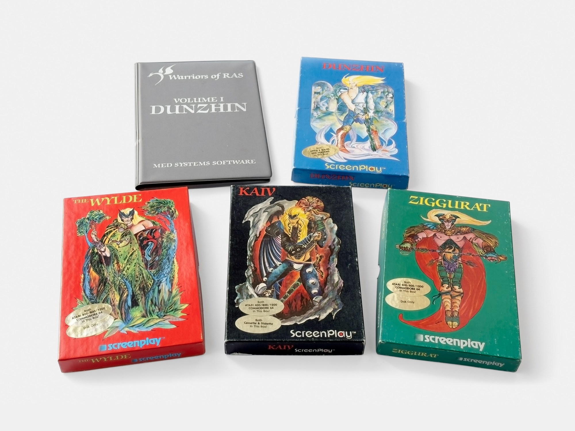 Dunzhin (dungeon), the first title in Randall Don Masteller’s Warrior of Ras series was initially released by Med Systems Software for the TRS-80 in 1982, in a grey binder (top and left). The same year Med Systems was acquired by Screenplay, a division of Intelligent Statements, and the title was rereleased for the Apple II, Atari 8-bit, Commodore 64, and IBM PC (right).