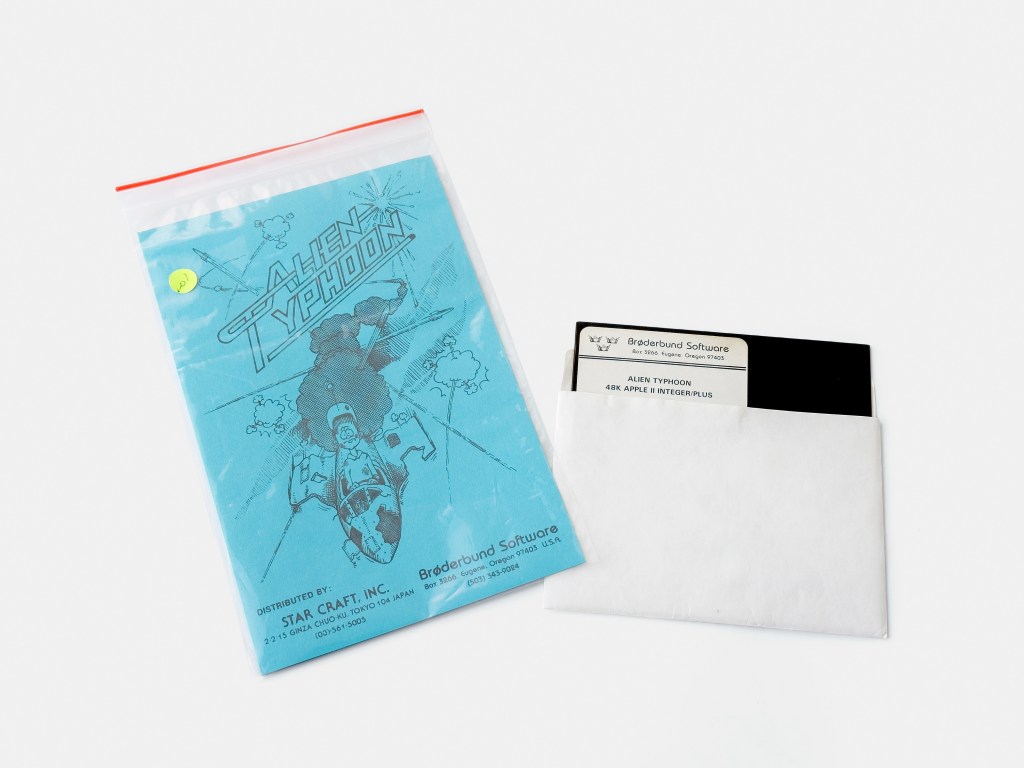 During 1981, Brøderbund published a handful of titles from Nakazawa‘s Star Craft, including an enhanced version of Suzuki’s Galaxian dubbed Alien Typhoon which was advertised for the fanatics only, with twice as many aliens, twice as fast, and twice as tricky!