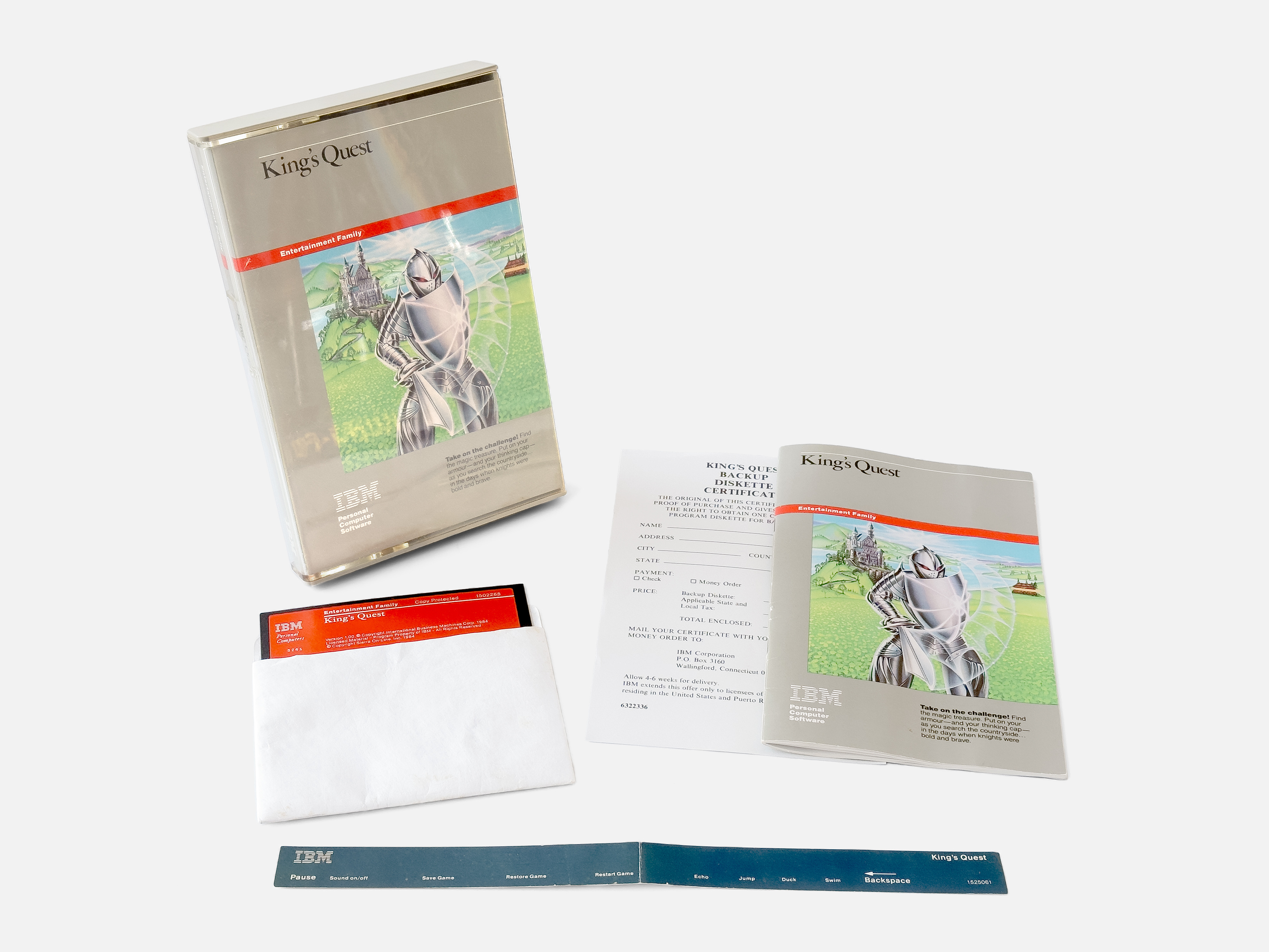 By 1984, IBM had successfully filled the market with nearly 5 million PCs, complemented by an additional 2-3 million IBM-compatible systems from other manufacturers. The rapidly growing market was unquestionably better suited for a triumphant PC version of King’s Quest, to compensate for the lackluster sales of the PCjr version. At the end of May, only a matter of weeks after the PCjr release, Sierra self-published King’s Quest for the IBM PC. The release featured vastly improved cover art, now skillfully portraying the game and its storyline, and was complemented by a heightened dramatic backstory within the accompanying manual by editor and writer, Annette Childs, who was working in Sierra’s marketing and packaging department.