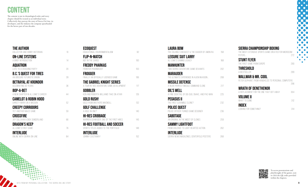 37 distinct chapters highlighting various aspects of the company’s history through a selection of titles released between 1980 and 1996. Collectively, they help tell the story of Sierra On-Line, its developers, and the industry the company spearheaded for the better part of two decades.