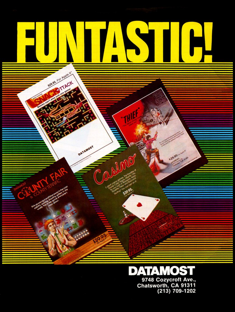 Datamost’s Funtastic! served as the heading for its 1982 “Games & Beyond” product catalog and appeared in print ads promoting its early software lineup, including Snack Attack and Country Fair. Ironically, the name would soon be repurposed by Dan Illowsky and Michael Abrash for their independent label after departing the company.