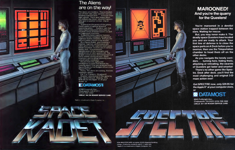 Following Illowsky’s departure, Datamost reportedly withdrew Space Kadet from publishing. Interestingly, the same cover art visuals, with a few changes, also appeared on the packaging and advertising for Datamost’s Spectre, a 3-dimensional maze action game developed by Bob Flanagan and Scott Miller. The reuse of assets could suggest that Space Kadet might have been pulled from the market early on.