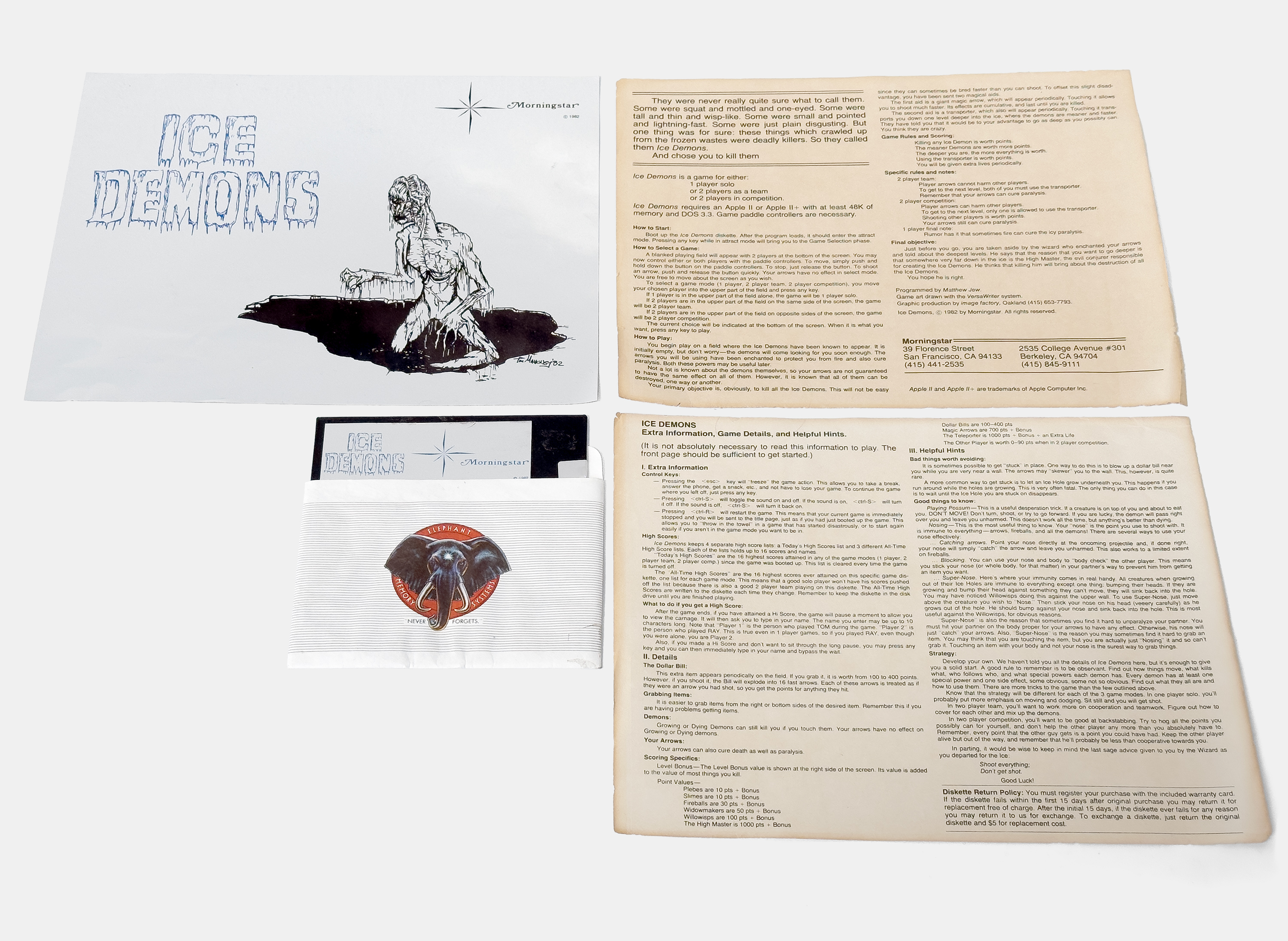 Jew took it upon himself to market and publish the game. He enlisted Image Factory, a small Oakland-based studio, to handle the game’s physical aspects. Unlike the plain sleeves and photocopied labels that adorned most small-scale releases, Ice Demons shipped with a dazzling mirror-like cover evoking the sharp, icy shards from which the demons in the game emerged. The artwork was screen-printed directly onto the reflective surface, resulting in a product that felt extremely premium. For publishing, he created the Morningstar label.
