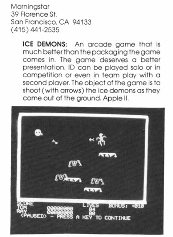 That same month, Ice Demons earned a brief mention in Computer Gaming World’s “Taking a Peek” section, where it was summarized in a few lines, between dozens of new releases jostling for attention in the rapidly expanding marketplace.
