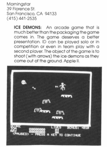Jew submitted Ice Demons to Softalk magazine, hoping for that all-important review that could help an independent title break through the noise. It arrived in the February 1983 issue. The verdict was mixed but respectful: “Although marred by poor animation, rather boring sound effects, and occasional image flicker, the inventive quality of the concept plus its totally unique modes of play make Ice Demons a significant game and Morningstar a company to watch.”