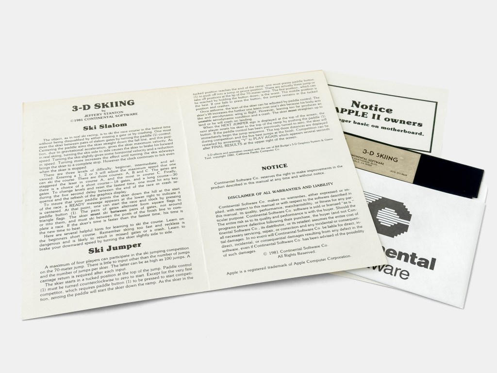 As an avid skier, spending considerable time skiing following his move west, and with fond memories of Vermont slopes from his college years, Stanton turned to the sport as the subject of his next project. Skiing gave him both a personal connection and a technical challenge on how to recreate the sensation of speed, depth, and movement on the Apple II’s limited hardware. It was the perfect testbed for his growing fascination with stretching the boundaries of computer graphics.