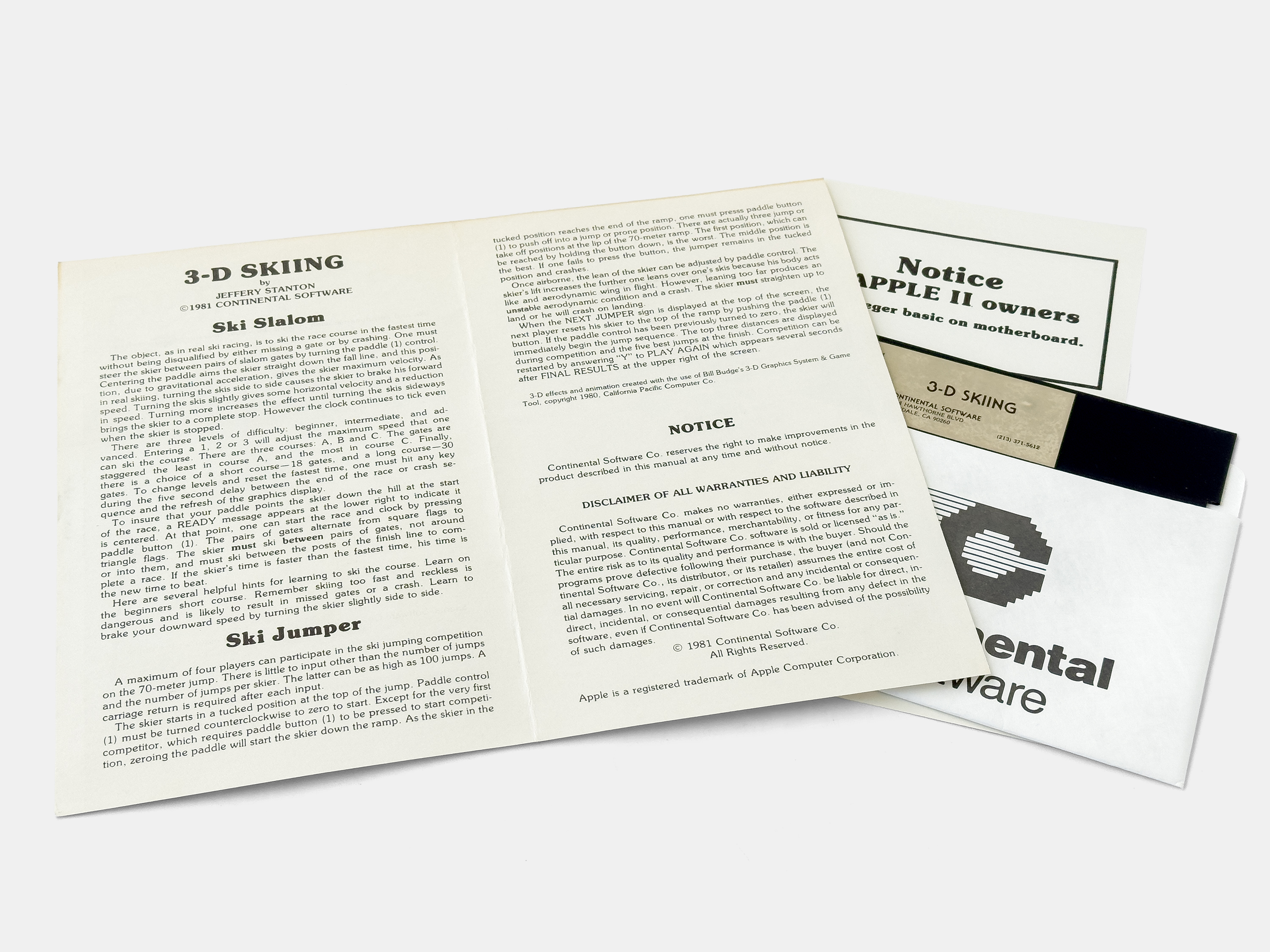 The result was 3-D Skiing, an ambitious attempt at forward-scrolling pseudo-3D. With the illusion of motion, created through scaled graphics and carefully timed assembly routines, players “hurtled” downhill against the clock, weaving through slalom gates. For Apple II owners, the effect was remarkable, dynamic, and fast-paced in a way few games of the era attempted. The package also included a second event, a more traditional 2D ski-jumping contest controlled with the Apple II’s paddles. Combined, the game stood out in hobbyist circles for its originality and technical daring, offering players a taste of perspective and speed at a time when most computer games were still locked into flat, static screens.