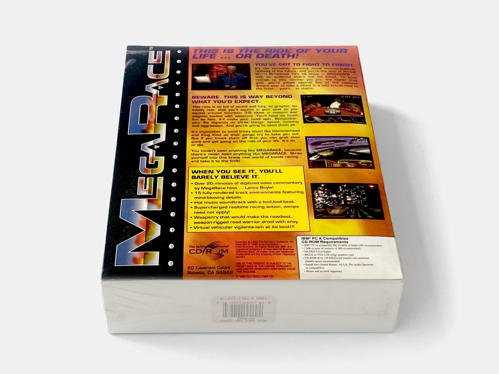 MegaRace blends futuristic combat racing with full-motion video trickery. Players speed through pre-rendered 3D tracks, steering a 2D car sprite while battling enemy drivers in a deadly TV game show setting. Guided and constantly mocked by over-the-top host Lance Boyle.