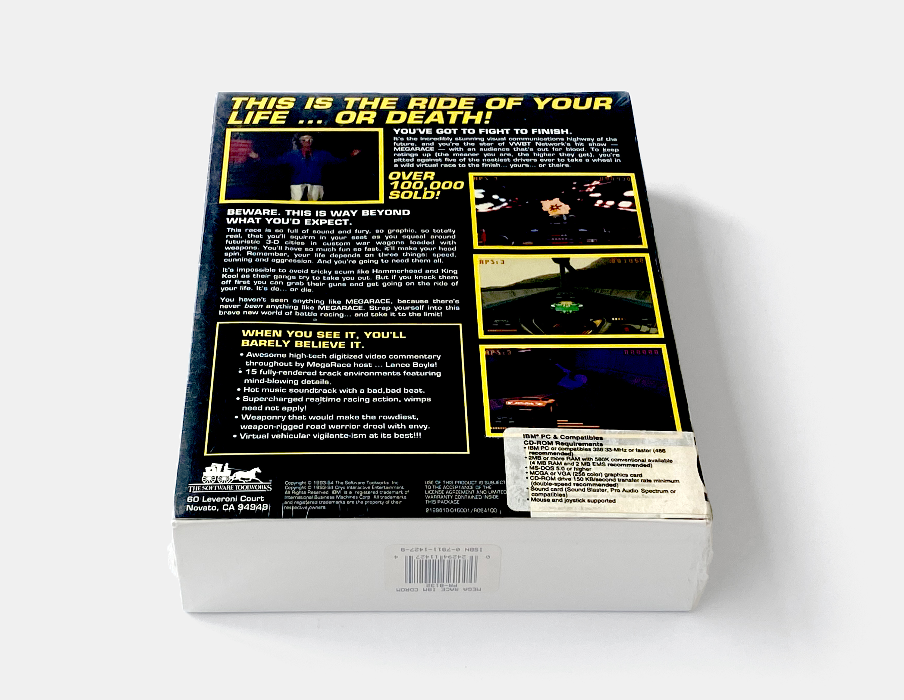 The first retail box carried Toolworks’ standard branding, but a year later it returned in a black “Best Seller Series” reprint boasting a “100,000 copies sold” sticker, reflecting the publisher’s new budget-line push. Its reach expanded dramatically when Packard Bell, the same year, began bundling it with its home PCs, a practice that continued through 1997. Packard Bell’s own marketing campaigns often listed MegaRace alongside Microsoft Encarta as proof of what a CD-ROM drive could deliver, a futuristic racer and a digital encyclopedia pitched together as the “killer apps” of the new format. For countless households, MegaRace wasn’t a game they sought out in stores; it was their very first CD-ROM experience, delivered straight out of the box by Packard Bell.