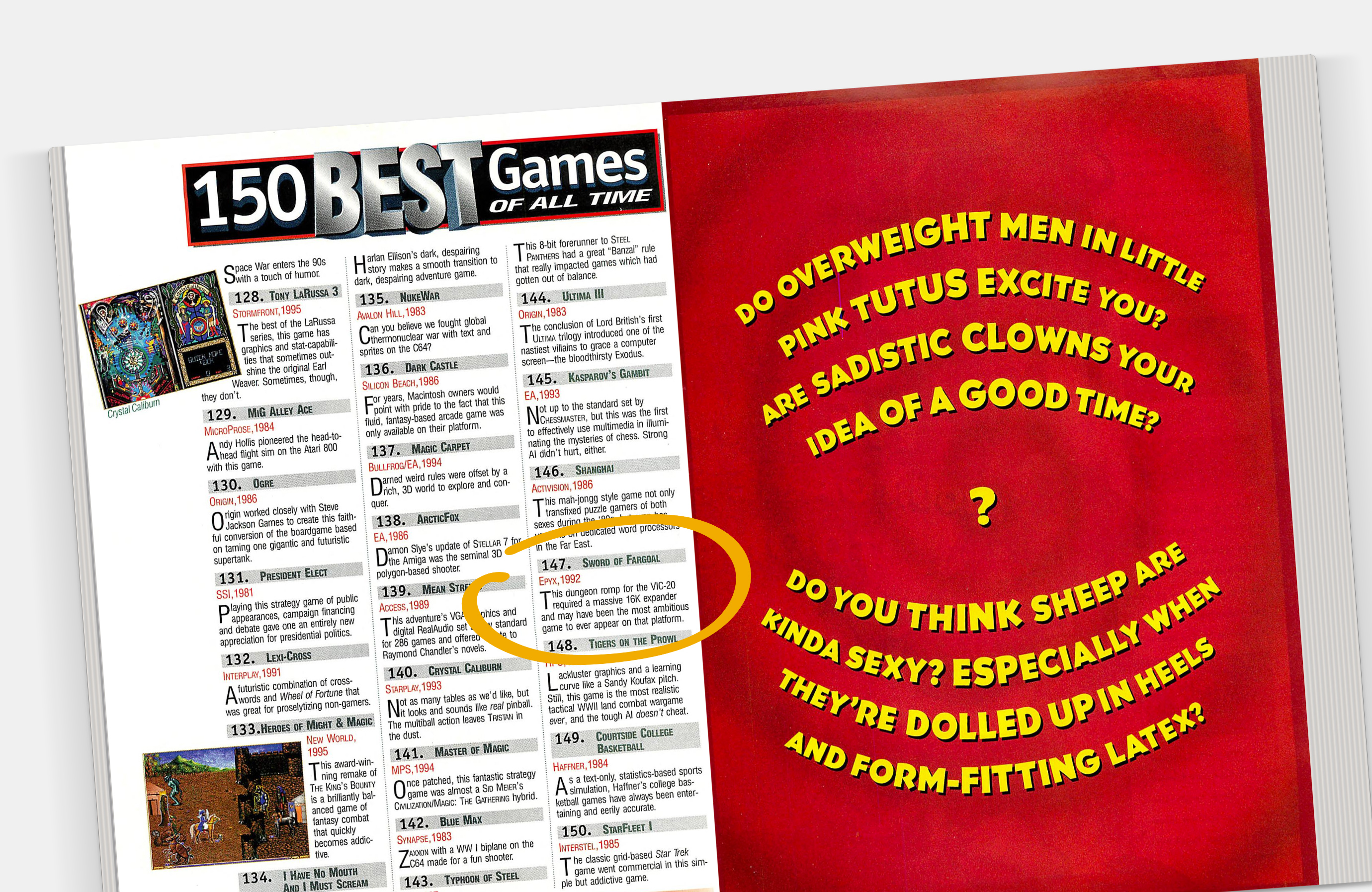 In November 1996, Computer Gaming World, Issue 148, ranked Sword of Fargoal #147 in its “150 Best Games of All Time.”