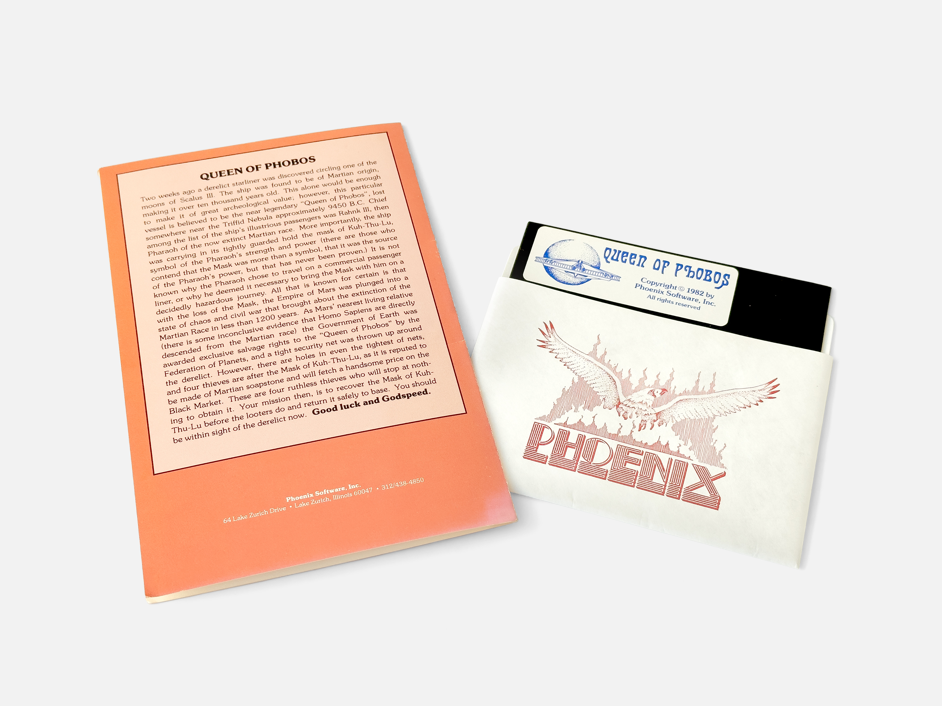 Phoenix Software’s third adventure title, and the first to feature graphics, Queen of Phobos, released in 1982, used “High-Res graphic adventure” on the cover, a wording that put them into a legal dispute with Ken and Roberta Williams’ Sierra On-Line.