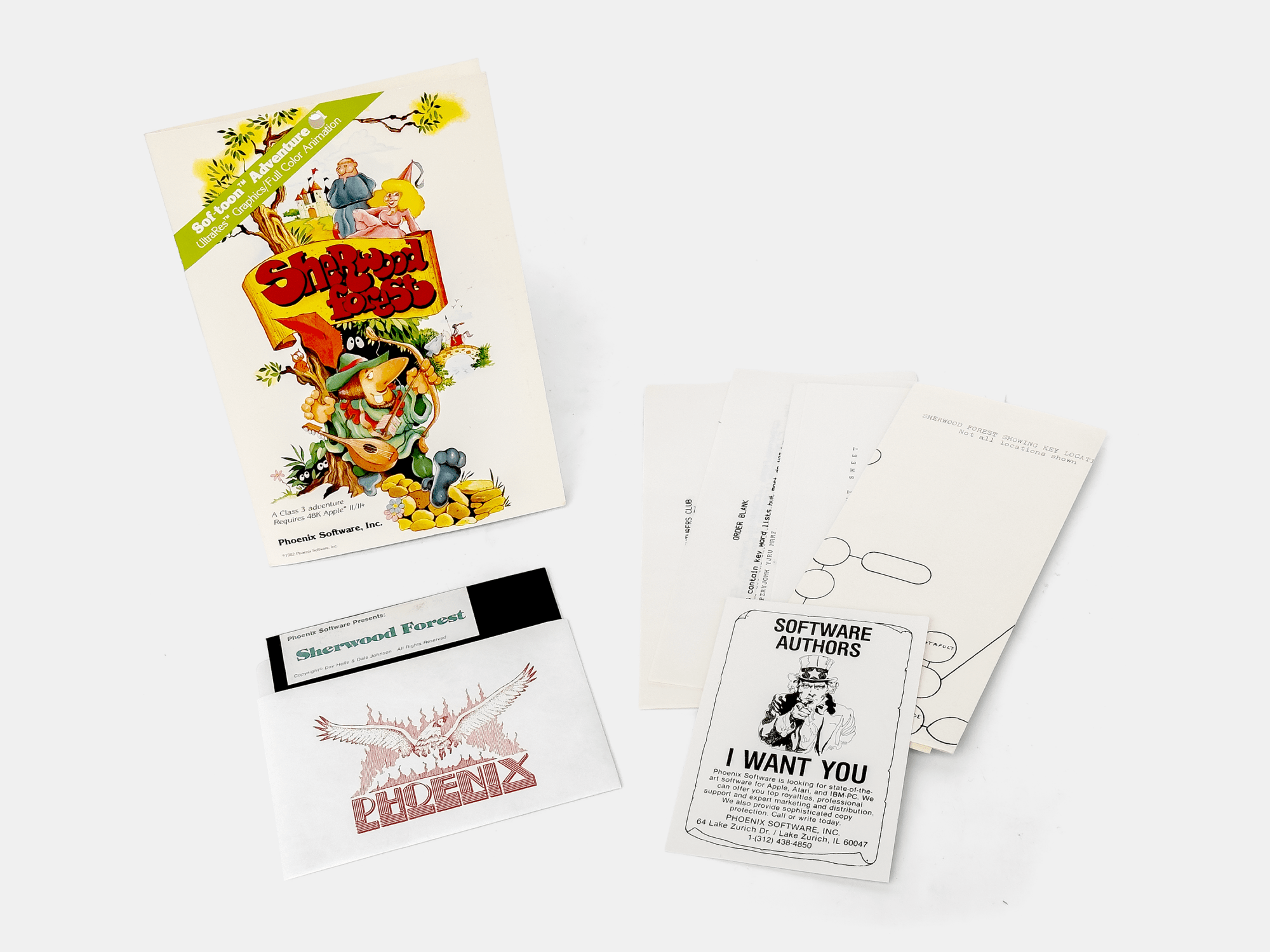 Sherwood Forest was mentioned as early as 1981, in a letter from Unrath to dealers. Later, in a Phoenix Software dealer price list dated May 27, 1982, it was noted that it would be available in September of the same year.