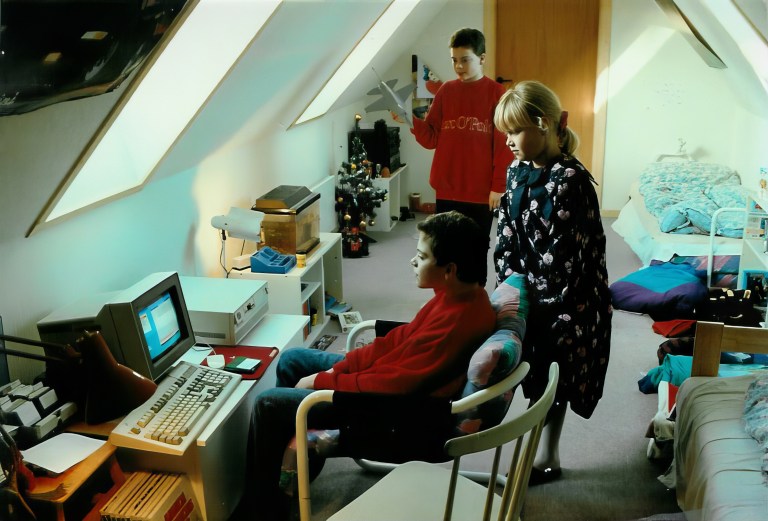 Our room around Christmas 1991, with me in front of our Intel 286–based IBM PS/2 Model 50.