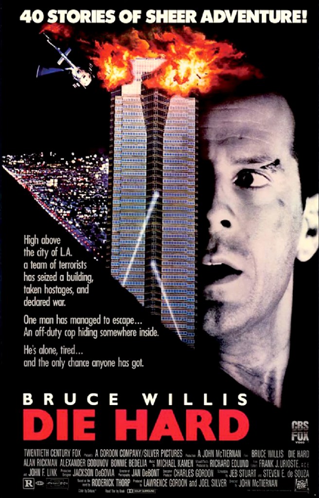 Die Hard starring Bruce Willis as John McClane and Alan Rickman in his film debut as Hans Gruber. McClane, an NYPD officer, attempts to save his wife and other hostages taken during a Christmas party, though the poster gives no hint of the holiday setting.