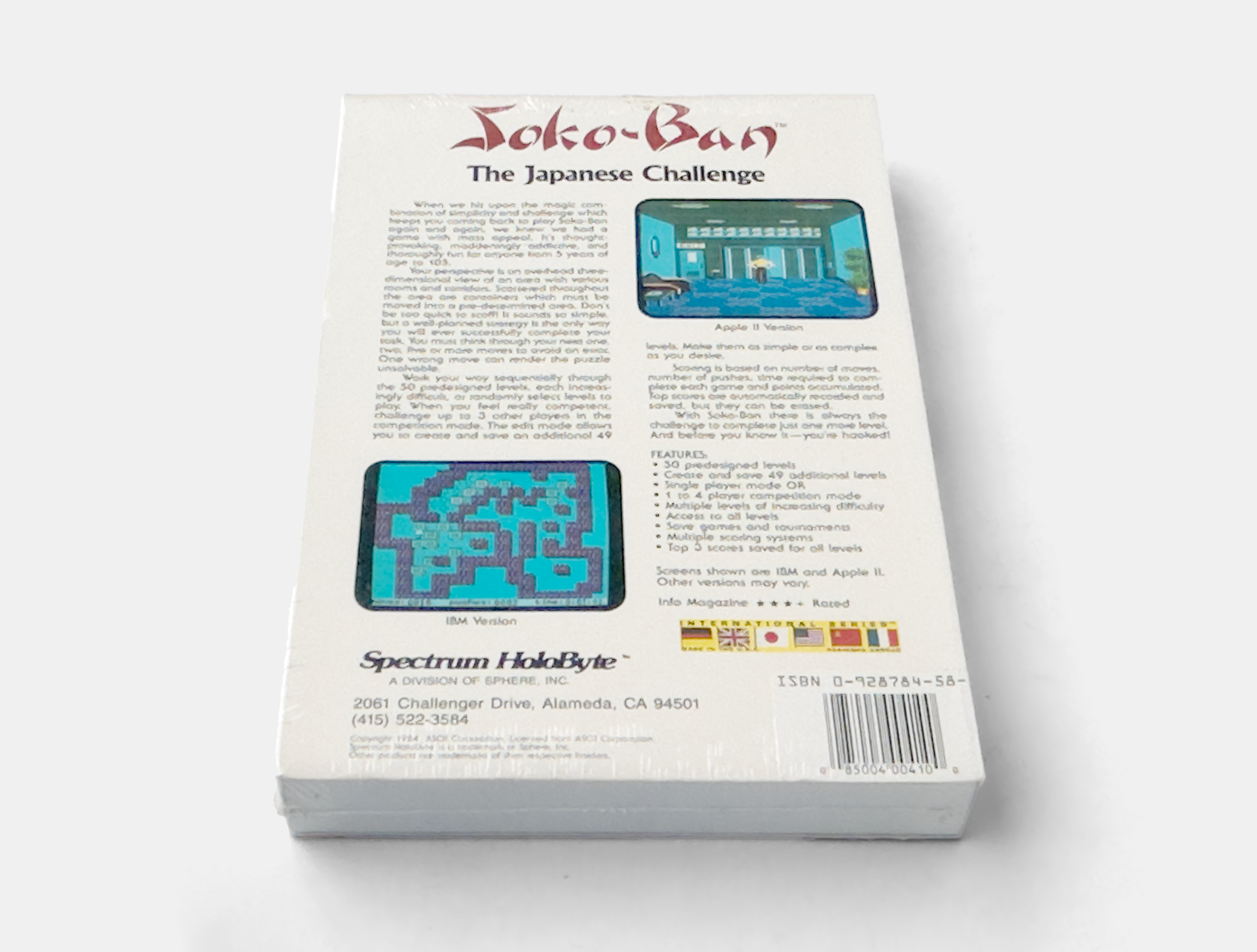 In the late 1980s, American publisher Spectrum Holobyte licensed the Sokoban concept from its Japanese rights holders and brought it to Western home computers under the title Soko-Ban. Versions were released in 1987–1988 for the Commodore 64, IBM PC, and Apple II. Spectrum Holobyte’s release included 50 classic Sokoban puzzles and was the first widely distributed Western edition, introducing many players outside Japan to this deceptively challenging puzzle format.