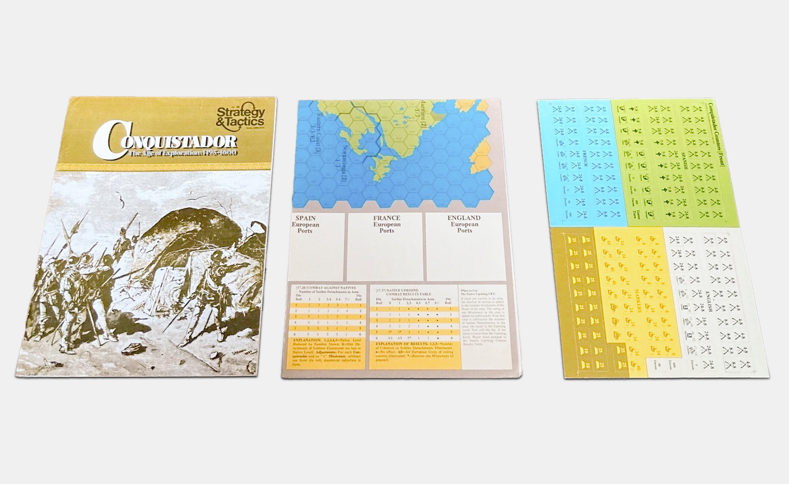 Issue 58 of Strategy & Tactics included Conquistador as a pull-out game simulating the exploration of the New World in the 16th century. Players assume the roles of European powers, sending expeditions to find gold and establish colonies. The game was designed by Richard Berg, with assistance from Greg Costikyan.